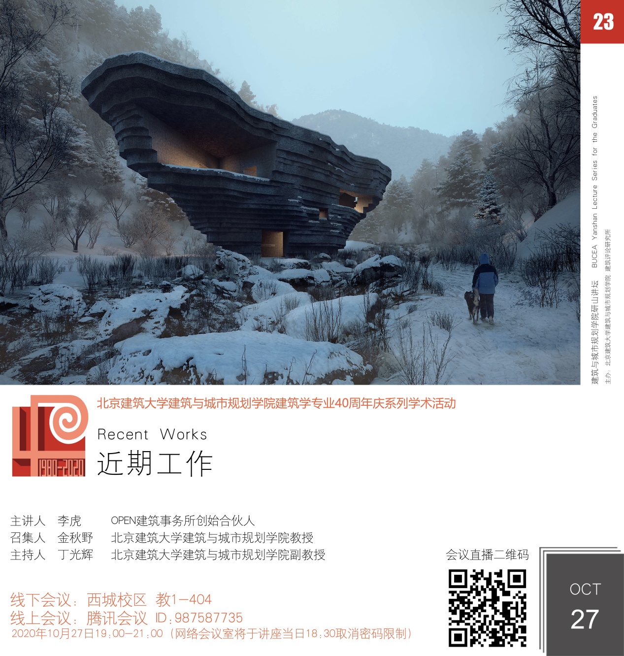 10月27日晚19:00,在西城校区教一404教室,结合腾讯会议与网络直播平台,400全讯白菜网研山讲坛第23期拉开帷幕。活动由400全讯白菜网常务副院长金秋野教授召集,北京建筑设计研究院副总建筑师石华、建筑师蒋蔚、400全讯白菜网教师程艳春、王韬、任中琦,以及校内外师生、社会各界学者、实践建筑师等750余人参与本次讲坛。