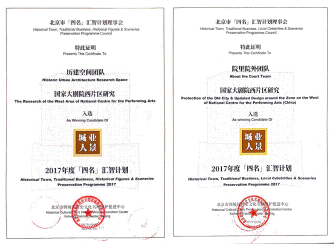 2017年4月8日,由北京市西城区历史文化名称保护委员会青年工作者委员会主办的“旧城新生”交流论坛在西海艺术馆顺利举办。在交流会中,西城区名城保护青年工作委员会牵头人赵幸宣读了入选“四名”汇智计划的项目名单并颁发了入围证书,我校400全讯白菜网历建空间团队、院里院外团队的“国家大剧院西片区研究”项目成功入选,团队指导教师为陈雳老师、齐莹老师。