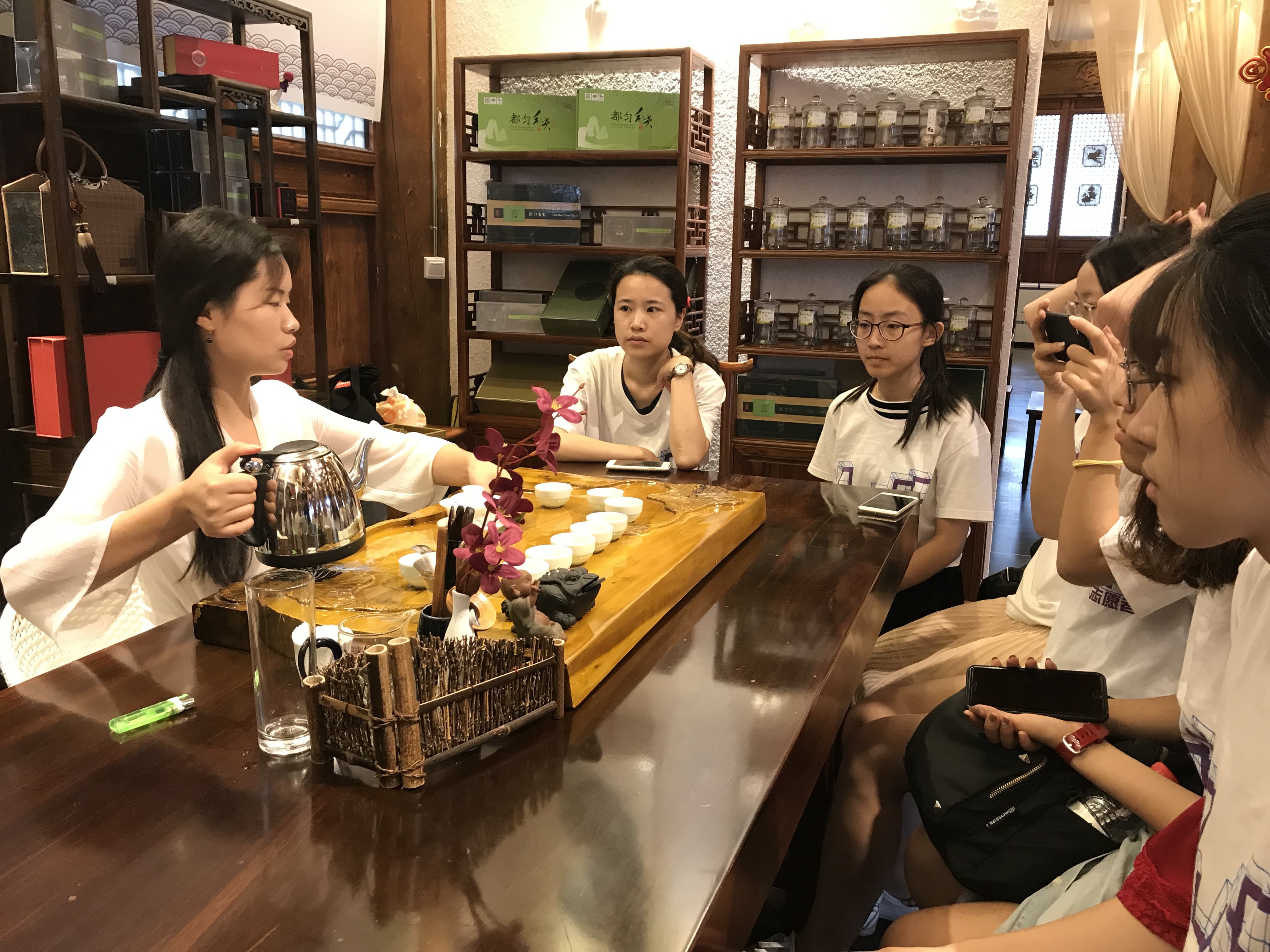 实践团成员在茶博园内茶艺师的带领下品茶认茶,并与茶艺师交谈,了解茶学文化。从认茶,沏茶,赏茶,闻茶,茶艺师像对待艺术品一样精心的将都匀毛尖的香气融进温热的水里,化作一盏香茗。实践团成员品味着毛尖的香味,更是品味着中国茶文化的韵味。在幽深抑扬的古琴声中,茶艺师为成员们讲解了茶学的基础知识,成员们也提出了与茶文化传承、建筑文化体验等相关的问题,茶艺师都一一为我们解答。从茶叶的种植到茶叶的加工制作,再到沏茶品茶,每一步都透着中华文化的韵味。