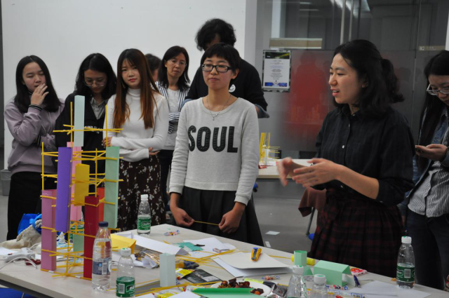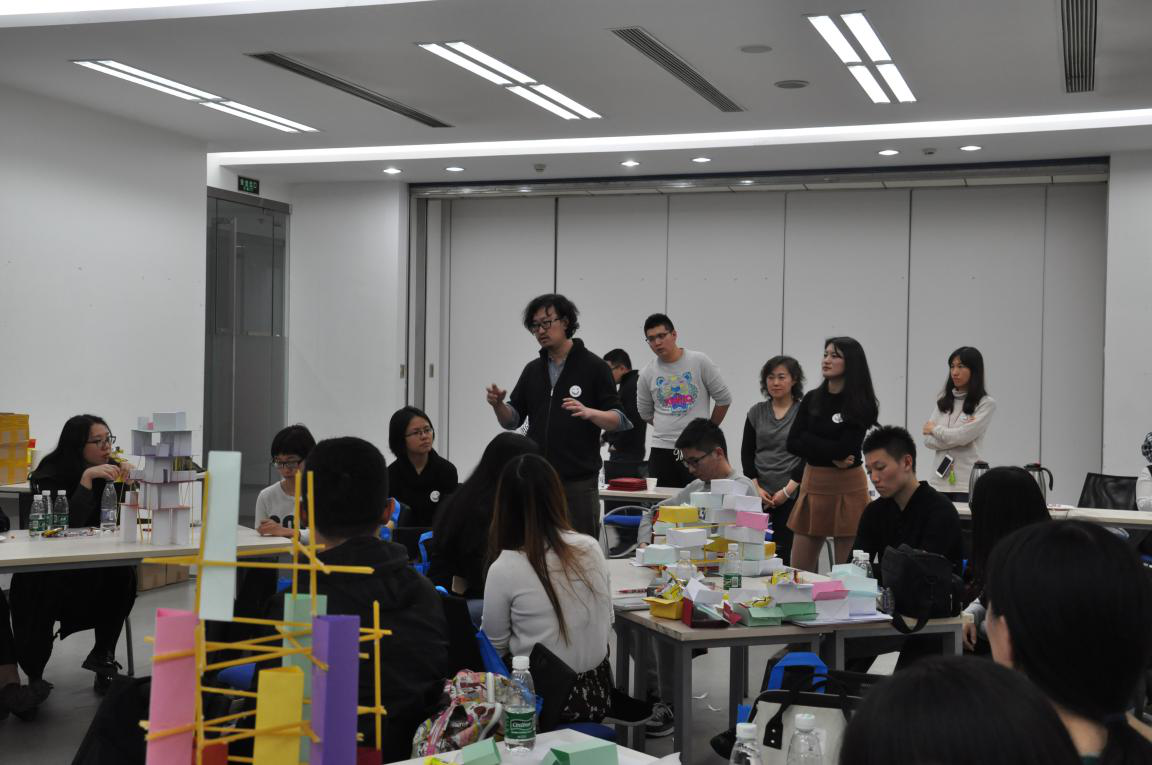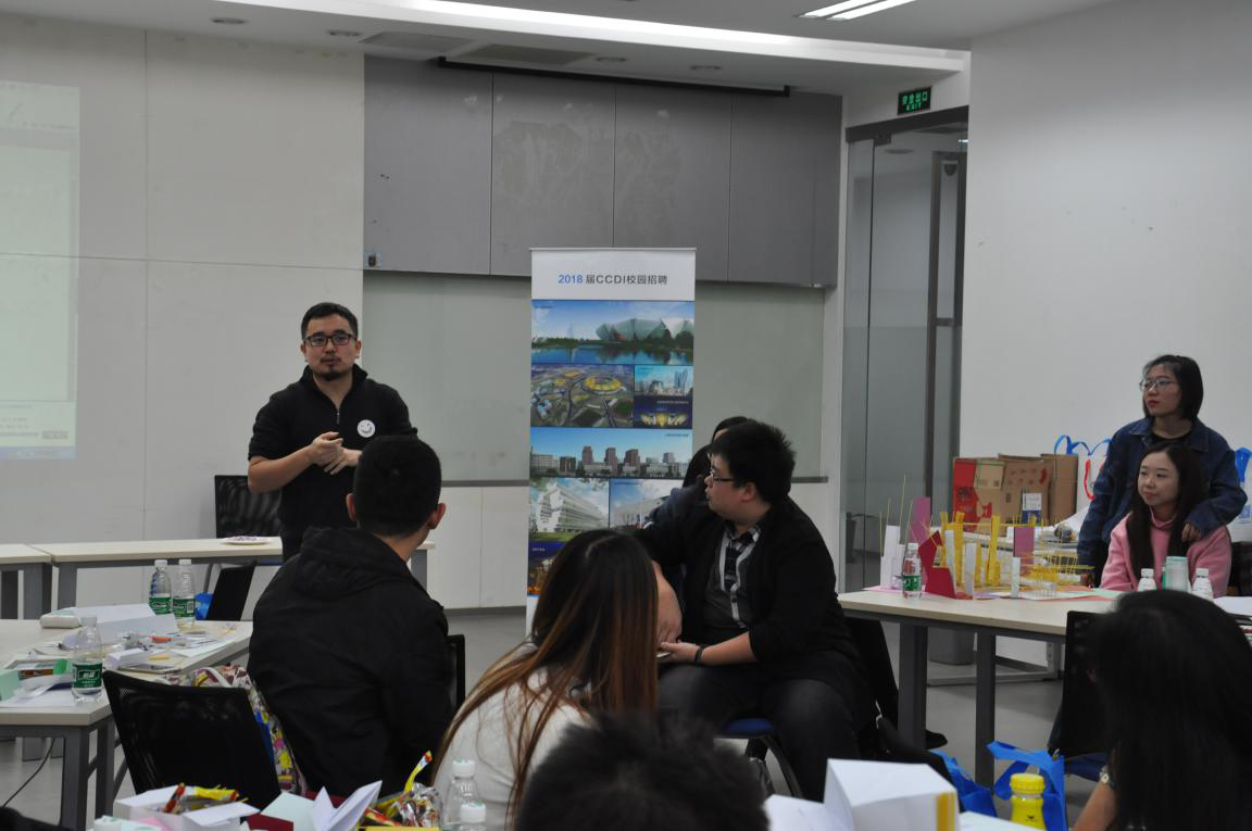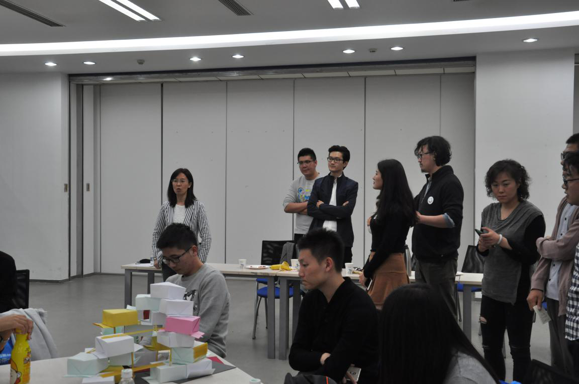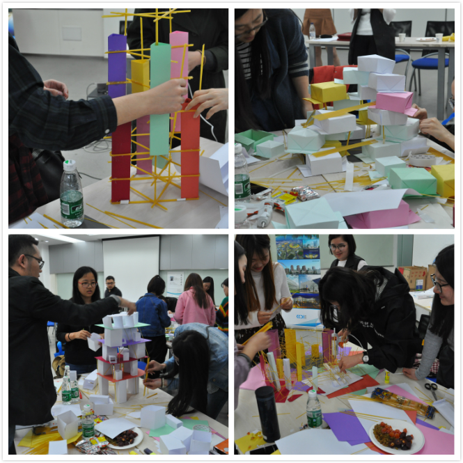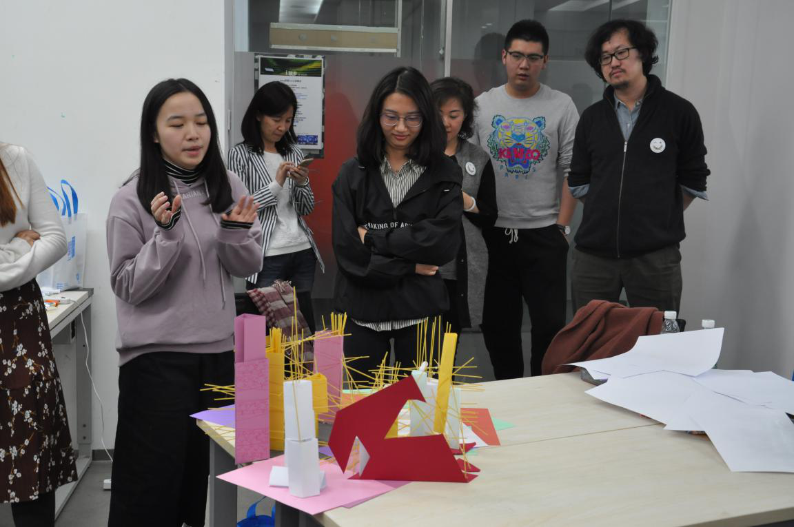 介绍结束后,两校师生来到悉地国际中心会议室,准备PK。PK的主题是创意社区,由公司提供意大利面、卡纸等模型工具,分成四组进行超级社区的搭建,意在根据生活中常见的物品,能否以一种全新的面貌呈现设计理念。两点半开始,各小组要在两个小时内完成创意搭建。
