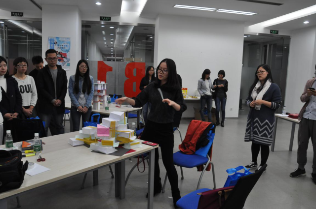 下午四点半,四小组在规定的时间内完成了各自的作品。活动进入到设计理念介绍、评选和点评环节。在设计理念介绍环节,各小组分别选派代表对从设计的专业角度阐释了自己的设计理念;在评选环节,首先进行各小组之间的互评、投票,接着由悉地国际新锐设计师宋帅、高宇航,资深设计师孙远、梅杨,新图渐进工作室负责人,新图建设业务发展中心马总分表针对每组的作品从设计的视角、建筑设计的本质等方面进行了点评、投票。此外,马总在总结时勉励同学们要认真学习、多进行实践,保持本心。