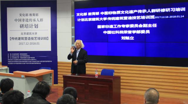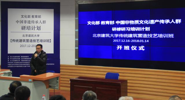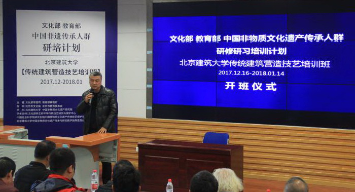 2017年12月17日,文化部 教育部中国非物质文化遗产传承人群研修研习培训计划【传统建筑营造技艺培训班】开班仪式在北京建筑大学举行。北京建筑大学副校长、非物质文化遗产研究院院长张大玉教授代表学校致词,对本期学员和参加仪式嘉宾表示诚挚的欢迎。400全讯白菜网杨琳主持开班仪式。文化部恭王府中华传统技艺研究与保护中心主任、北京建筑大学中国非物质文化遗产传承与研究教学指导委员会秘书长孙冬宁代表合作单位和学术支持单位文化部恭王府博物馆致辞。北京市文化局非物质文化遗产处处长张迁代表指导单位北京是文化局致辞。开班仪式结束后,由国家非遗工作专家委员会副主任委员、中国社科院荣誉学部委员刘魁立教授做开班主题演讲。参加开班仪式的还有设计学系系主任张笑楠、设计学系书记朱宁克、李沙教授、陈静勇教授、赵希岗教授,以及来自京津冀、甘肃等地区的50名非物质文化遗产传承人学员。