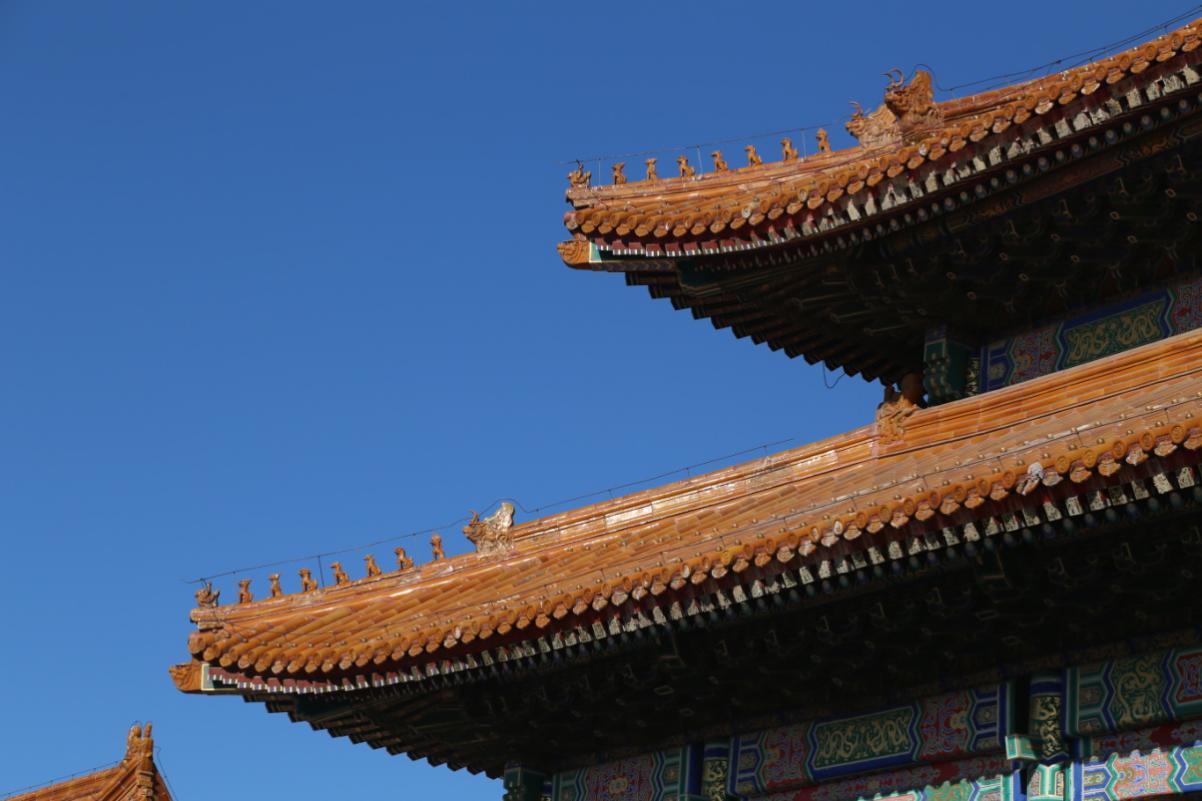 再说说细节,宫殿檐角的琉璃小兽一排排端坐,彰显着贵气与威严。屋顶上覆盖的琉璃瓦,是沾有釉料烧成的陶器,各色的釉琉璃瓦既能使屋顶显的光洁美丽,而且还可防雨水,增加耐久度。故宫屋顶多用黄色琉璃瓦,这些琉璃不但数量多,而且种类和起到的作用也是多种多样。雨水可以顺沟流下,并且不会浸到屋檐下的木料。