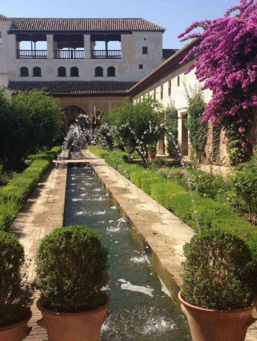 “阿尔汗布拉”,阿拉伯语意为“红堡”。是摩尔人留存在西班牙所有古迹中的精华,有“宫殿之城”和“世界奇迹”之称。宫殿依山而建,以远高近低的层级方式排布,高低错落。这里也与西班牙的宫殿一样,有主景观轴,轴线建为十字林荫路,交叉处设核心水池。厚实坚固的城堡式建筑围合而成庭院,庭园被墙环绕,被水道和喷泉切分,种植了大量的常绿树篱和乔木。