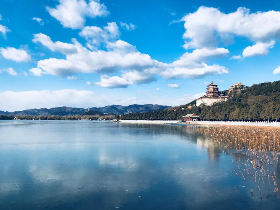 湖泊、峰峦、烟柳、塔影,相映成趣,古代造园家们,采用了借景的手法,将数十里开外的重峦叠嶂的西山、林木青葱的玉泉山、半山腰屹立着的玉峰塔,以及园中的一景一物,分别作为远中近三景,自然与人工相契融合,形成一幅美丽的画卷。与深秋的昆明湖不同的是如今的昆明湖已结上厚厚的冰,大人、小孩儿在冰面上嬉戏打闹,好不热闹。电视剧《甄嬛传》中,安陵容的冰舞的窈窕身姿,使我想起了故宫博物院里收藏的由乾隆年间宫廷画家张为邦、姚文翰所绘的展现宫中冰嬉的《冰嬉图》,或许当年也同今朝一般热闹。在这堆砌的美景之中,使我记忆最为深刻的,不是昆明湖的美景如画,而是湖前随意点下的树。不同于现代规规矩矩地按照行距种树,而是还原自然,顺其自然,树木有疏有密,甚是有趣。“极目所至,俗则屏之,嘉则收之”。
