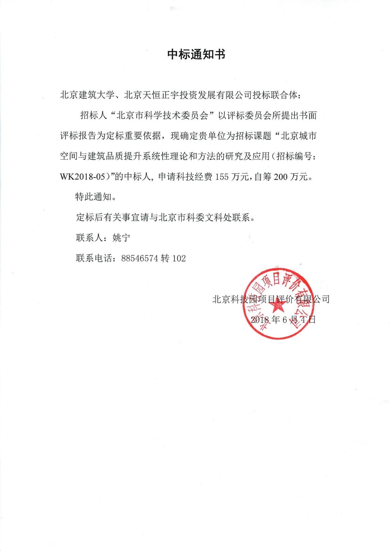 2018年6月4日,北京市科学技术委员会确定北京建筑大学、北京天恒正宇投资发展有限公司联合体中标“建设‘设计之都’促进文化科技融合(科研)”专项的招标课题“北京城市空间与建筑品质提升系统性理论和方法的研究与应用”(招标编号:WK2018-05),申请科技经费155万元,自筹示范经费200万元。这是我校首次中标市科委"设计之都"专项重大课题。
