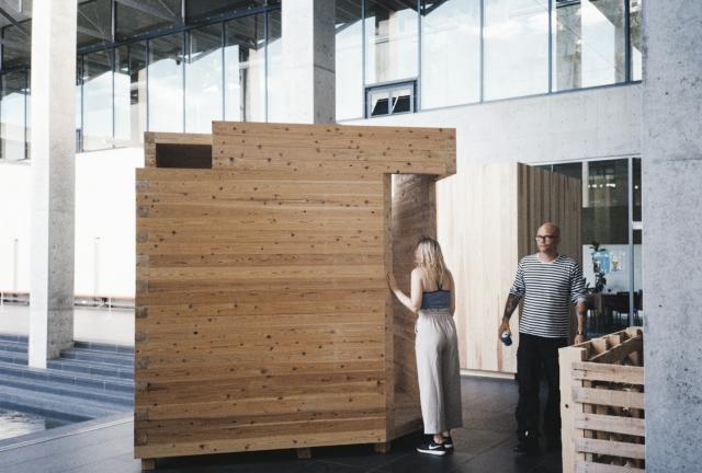 设计师利用传统的榫卯技术,不使用任何金属连接,单凭一种材料和构造方式便搭建出了一个可以移动的“小屋”。构件被切分成便于运输和安装的尺寸,拼接的肌理和材料的截面通过原始的方式表达出来。当“小屋”不再承担任何使用功能时,可以将其拆除并加工成其它木质产品,以此实现材料的再生利用。