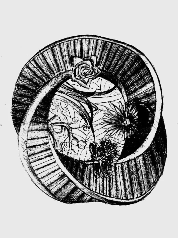 时空扭转,无限循环,本不会相遇的两点,在莫比乌斯环里重合,连接首尾,互为谜底。没有起点和终点,没有世人说不清的正反,只有走不完的轮回。拧劲与裂变,无中生有地,有地生阴阳。在看似绝境之处,却又能重遇生机,踏上阶梯,前路永无止境,亦如我们的生活,每一次磨炼过后总会发现新的奇迹,希望依旧在身边。莫比乌斯环打破传统空间,其界限越发模糊而越发完美,与山地玫瑰、生石花、梅花、松树结合,生命不止,尽头不在。