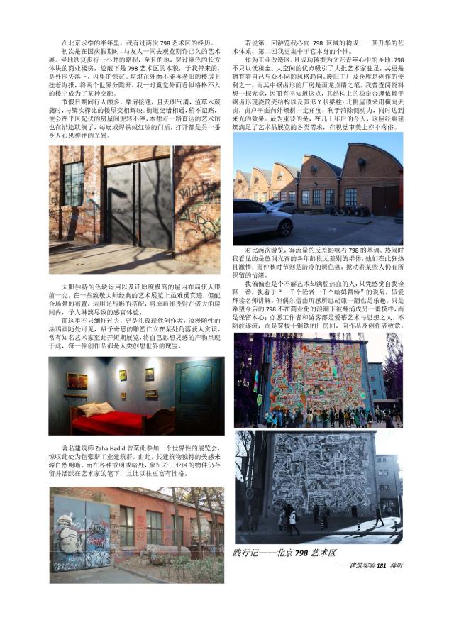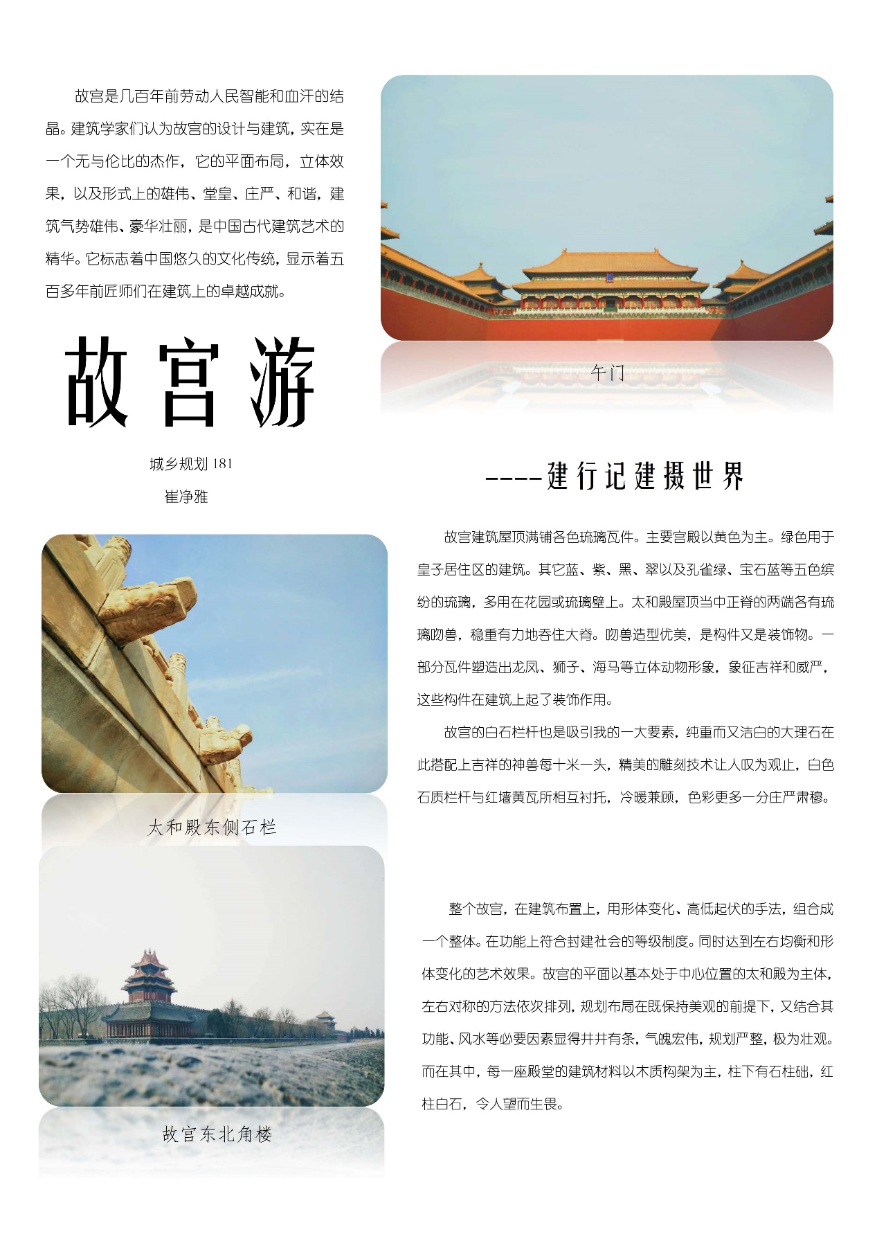 近期,团委学生会将选取“建行记”提前投稿的作品中,文字或排版较好的进行定期推送,供大家参考或批评。让我们跟随建院学子的“建行记”,共飨建筑文化之魅力。