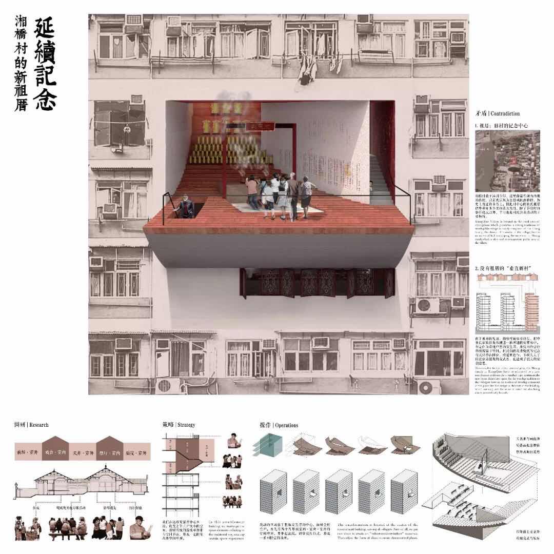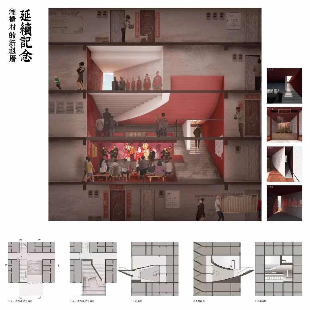 蔡斯巍、焦天、王逸品三位同学的设计研究从民间纪念传统出发,他们敏锐地发现在福建漳州,这一闽南地区历史最久远的城市中一直有着很浓厚民间祭拜风俗。漳州市郊以黄氏宗族为主的湘桥村,由于城市的发展面临一次整体搬迁。然而新的安置房没有给曾经处于中心地位的祖厝提供空间,村民们在失去活动场所的同时,也失去了精神寄托。竞赛方案利用上下三户的空间,将前埕、戏台、天井和拜殿四个典型的祖厝空间节点塞入安置房内。垂直向的空间操作既满足了传统空间序列中“室内-室外-室内”的空间体验,又能创造传统祖厝中丰富的高差变化。在这个新祖厝中,村民们的纪念活动得以延续。