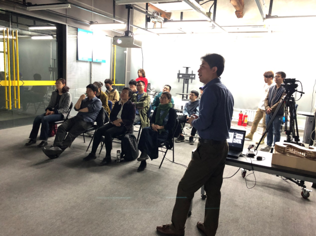 培训首先由李春青副院长对孙鹏一行的到来表示欢迎,并介绍我校国家级虚拟仿真实验中心的建设情况和未来拟开展的研究方向及形成成果。去年开始,建筑技术部主任邹越老师、实验中心主任陈玉龙、杨振老师牵头,协同相关老师,带领我院本科生朱轩宇同学与联想集团晨星AR部门已经进行了近半年的合作研发,已初步形成了部分针对建筑教学中的建筑场景搭建与展示技术和方法的成果。此次培训首先对前一阶段的合作研究成果进行介绍与展示,其次联想集团孙鹏从重点项目介绍、建筑学教学场景的研发以及AR互动体验三个方面对联想晨星AR项目进行了介绍,展示了针对教学环节开发的实验性项目,并与在场师生进行了虚拟现实系统的互动体验。
