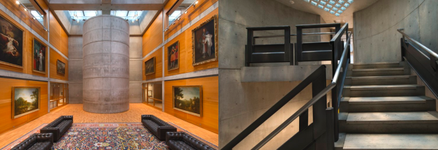 金老师提到最喜欢的康的作品是耶鲁大学英国艺术中心,康在这个作品中回归了基本的框架结构,在常识里表达美,取消了单元独立的冗余空心结构,让空间重新流动起来,仅在屋顶上进行单元化的操作,给建筑注入秩序的意象。在匀质空间创造分化,一切表现为等级差序才表现为复杂。屋顶V字形的装饰性巨梁和地面精确的石灰华条带遥相呼应,清灰色暖黄色相呼应,次一级服务性的都是钢材,空间充满了康式的厚重典雅。