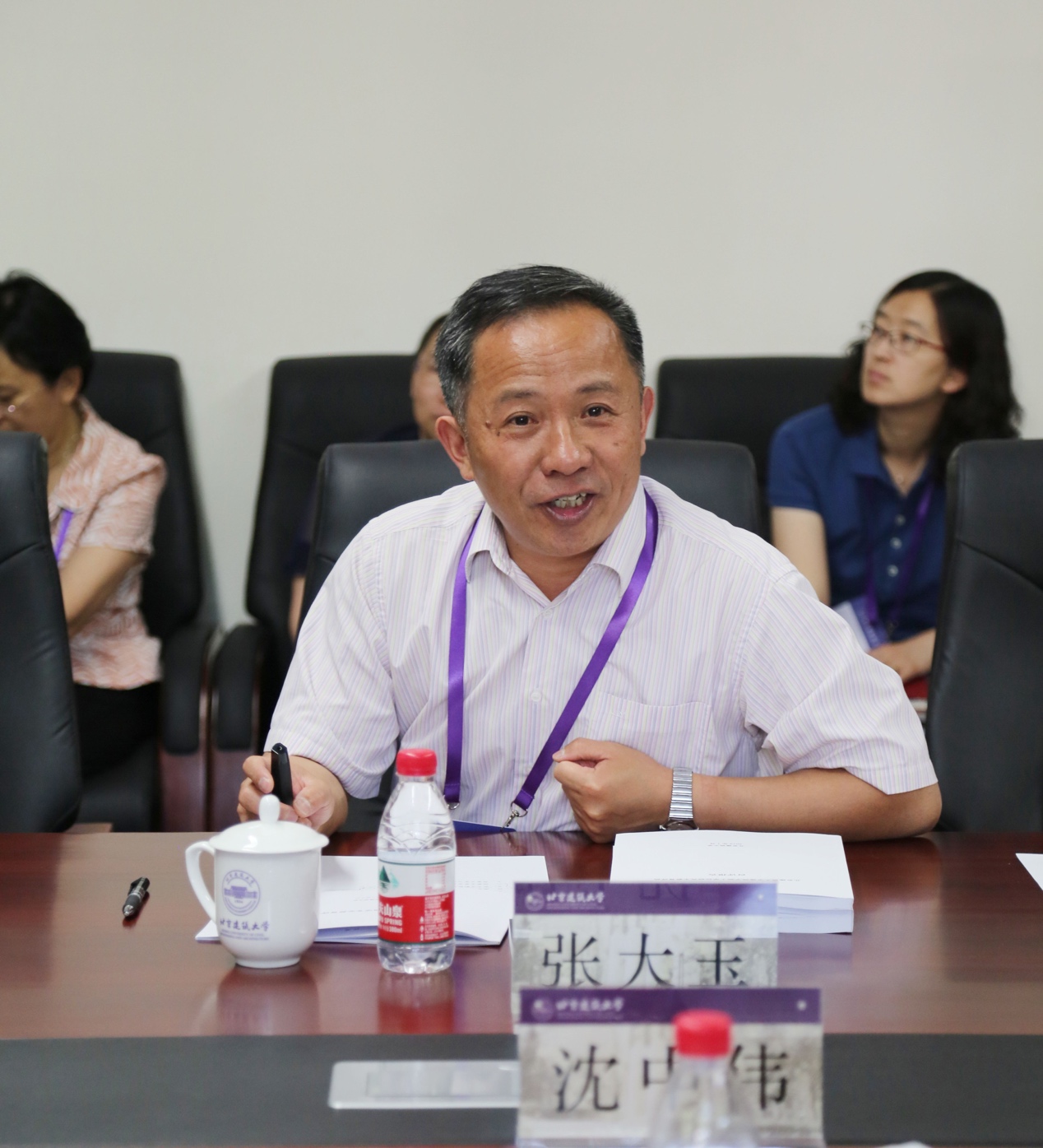 汇报会的第二阶段由专家组组长丁建正高级工程师主持,由张大玉副校长向专家组做了建筑学专业(学科)评估汇报。张大玉副校长从我校建筑学专业(学科)的校院概况与专业历史、专业目标与培养理念、培养方案与教学改革、师资队伍与教学资源、学生发展与质量评价、办学经验和专业特色、对上次评估反馈意见的回复、薄弱环节与改进措施等方面进行了详细汇报。丁建正高级工程师及各位专家认真听取了汇报,就报告内容和与会校院领导及教师进行了交流。张爱林校长在汇报会前看望了评估专家。学校领导和与会人员一起合影留念。