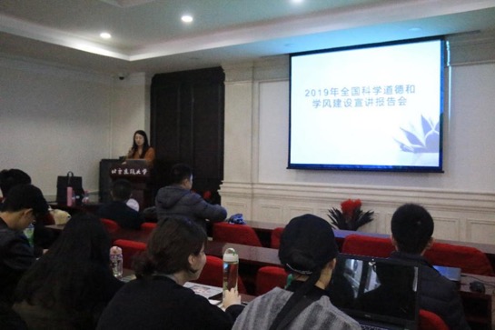 在会议开始,副院长金秋野进行了主题宣讲,强调当前学术道德与学风建设的重要性并深刻分析了学术道德的现状及本次报告会的意义。一是要认真学习大会精神,提高自身认识,加强自律;二是研究学术规范,自觉遵守,防患于未然。”其次,金老师讲解了六点同学们在今后学习过程中会遇到的学术不端问题,如:在研究和学术领域内有意做出虚假的陈述。损害他人著作权。违反职业道德利用他人重要的学术认识、假设、学说或者研究计划。研究成果发表或出版中的科学不端行为。故意干扰或妨碍他人的研究活动。在科研活动过程中违背社会道德。每个要点都以生动鲜活的案例加以解释,提醒同学们要有完善的治学理念,同时注重将良好的治学精神和道德品行融入到学业生活。