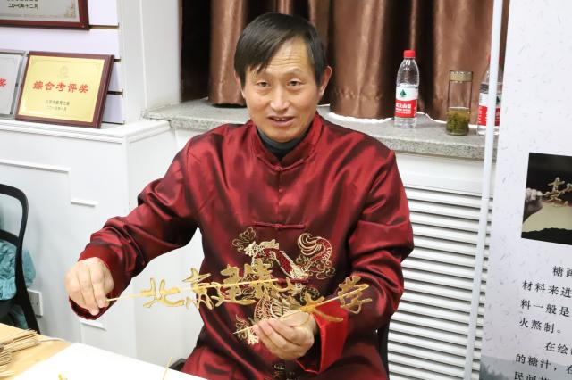 糖画是中国民间的一种传统手工艺,以糖为材料来进行造型的。所用的工具仅一勺一铲,糖料一般是红、白糖加上少许饴糖放在炉子上用温火熬制。在绘制造型时,由艺人用小汤勺舀起溶化了的糖汁,在石板上飞快地来回浇铸,画出造型,民间艺人的手上功夫便是造型的关键。当造型完成后,随即用小铲刀将糖画铲起,粘上竹签。糖画的题材有小说、戏曲人物、吉祥花果、飞禽、走兽、文字等。糖画老师幽默风趣,手法熟练,很快就创造了很多小动物、文字等糖画,还特意写了“北京建筑大学”送给同学们。