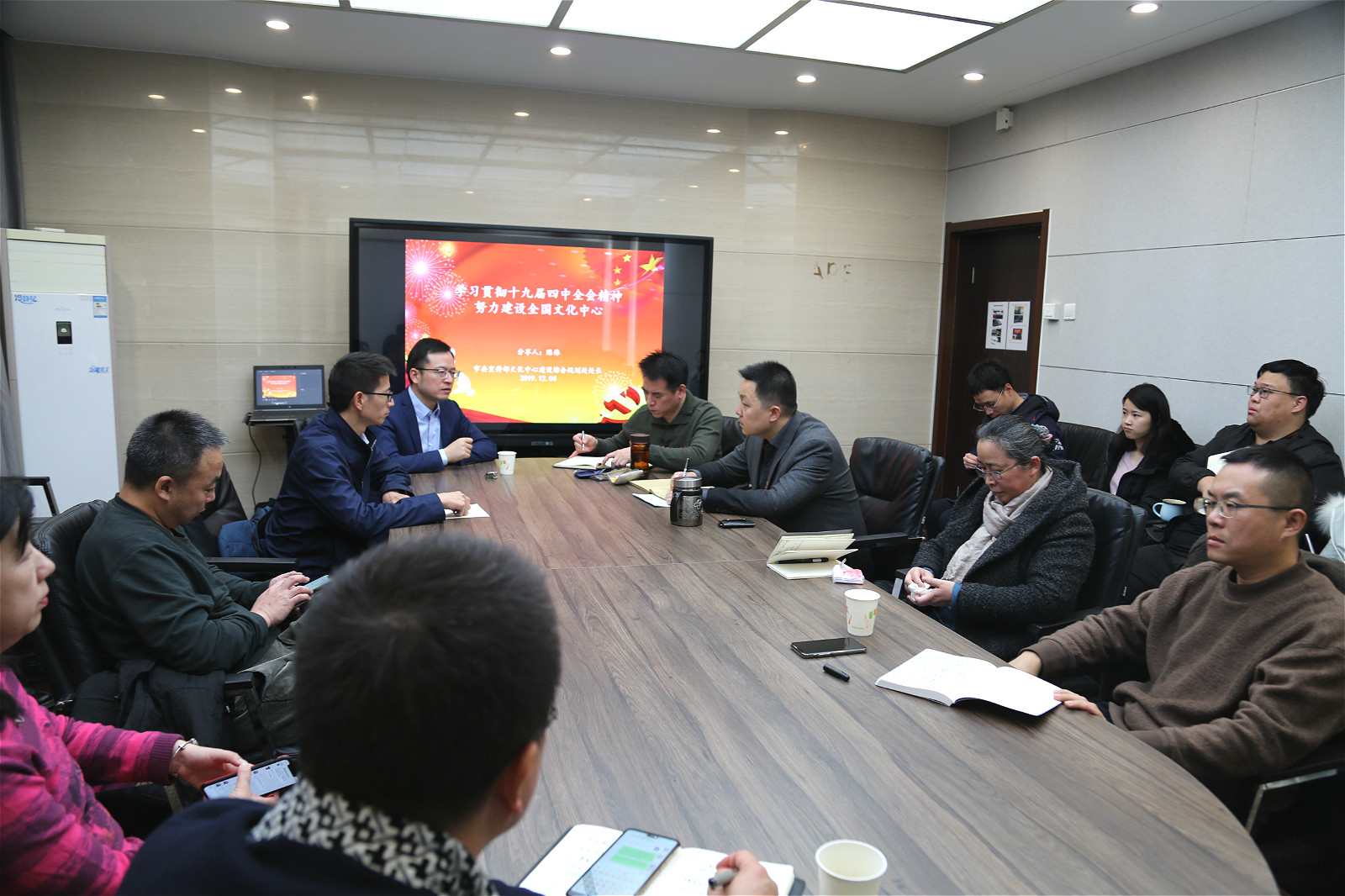 会议开始,陈伟同志从三个方面带领大家学习“贯彻党的十九届四中全会精神”一是汇报自己在四中全会精神的学习体会。其中四中全会中的制度自信对于理论自信、道路自信、文化自信、包括制度性在内的四个属性它是基本依据。其次用“13个坚持”系统总结了中国国家制度和国家治理体系13个方面的显著优势。再次强调要深刻领会十九届四中全会精神就必须牢牢把握基本国情。二是强调十九届四中全会报告第七部分“坚定文化自信,推动社会主义文化繁荣兴盛”是讲文化自信、文化精神力量,是国家治理体系和治理能力现代化的重要支撑。也是坚持创造性转化、创新性发展,是中华优秀传统文化的传承。增强“四个意识”、坚定“四个自信”,自觉承担起举旗帜、聚民心、育新人、兴文化、展形象的使命任务。同时进一步深刻阐示了在文化制度建设安排的五个方面。第一,坚持马克思主义在意识领域的指导地位的根本制度。第二,坚持社会主义核心价值观引领文化制度。第三,坚持健全人民文化权益的保障制度。第四,坚持建立正确舆论导向的制度。第五,坚持健全将社会效益放在首位的制度。三是就北京全国文化中心建设方面要深入贯彻落实“一核一城三带两区”总体布局,打造全国文化中心。即以培育和弘扬社会主义核心价值观为引领,以历史文化名城保护为根基,以大运河文化带、长城文化带、西山永定河文化带为抓手,推动公共文化服务体系示范区和文化创意产业引领区的建设。