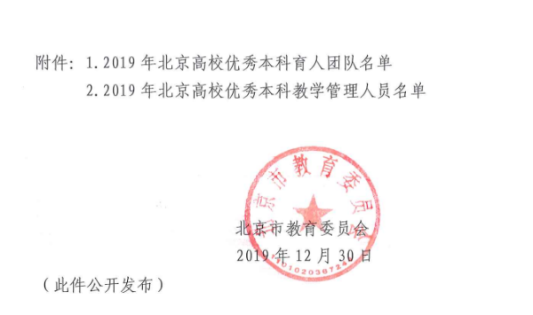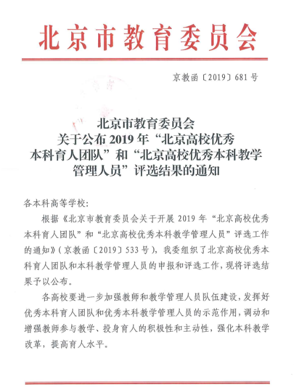 “北京高校优秀本科育人团队”的评选工作,是北京市教委落实立德树人根本任务,巩固人才培养中心地位,深化教育教学改革,提升教学团队育人水平的重要举措。2019年11月,市教委组织开展2019年“北京高校优秀本科育人团队”的申报和评选工作,经北京地区各高校自主申报、市教委审定并公示后,最终遴选出40个“北京高校优秀本科育人团队”。