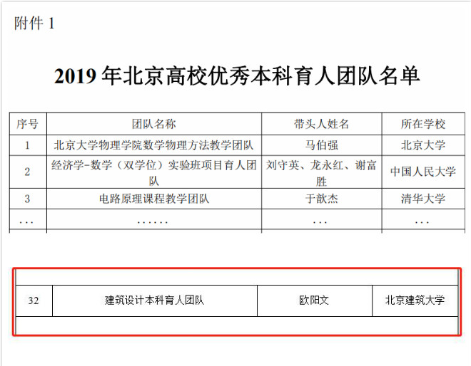 近日,北京市教委下发《北京市教育委员会关于公布2019年“北京高校优秀本科育人团队”和“北京高校优秀本科教学管理人员”评选结果的通知》京教函〔2019〕681号,我校“建筑设计本科育人团队”荣获2019年“北京高校优秀本科育人团队”。