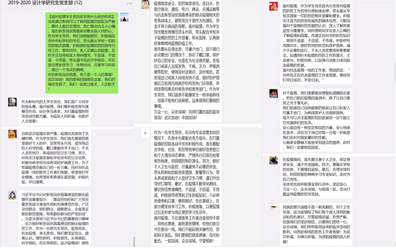 设计学研究生党支部将继续按照《北京市人民政府关于进一步明确责任加强新型冠状病毒感染的肺炎预防控制工作的通知》、《北京建筑大学新型冠状病毒感染肺炎疫情防控工作方案》的部署安排,切实履行责任,确保信息畅通,积极开展疫情防控宣传教育,充分发挥基层党组织的战斗堡垒作用和党员的先锋模范作用。