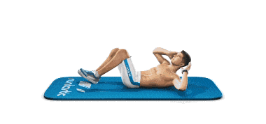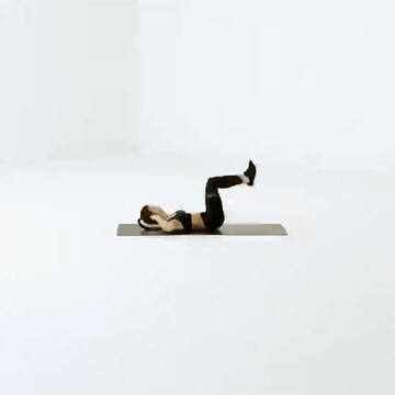开始姿态:躺于垫上,双腿屈膝抬起,大腿与地面呈90°,双手放于头两侧