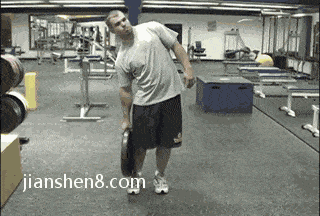 开始姿态:站立,单手哑铃负重(或肩扛杠铃)。