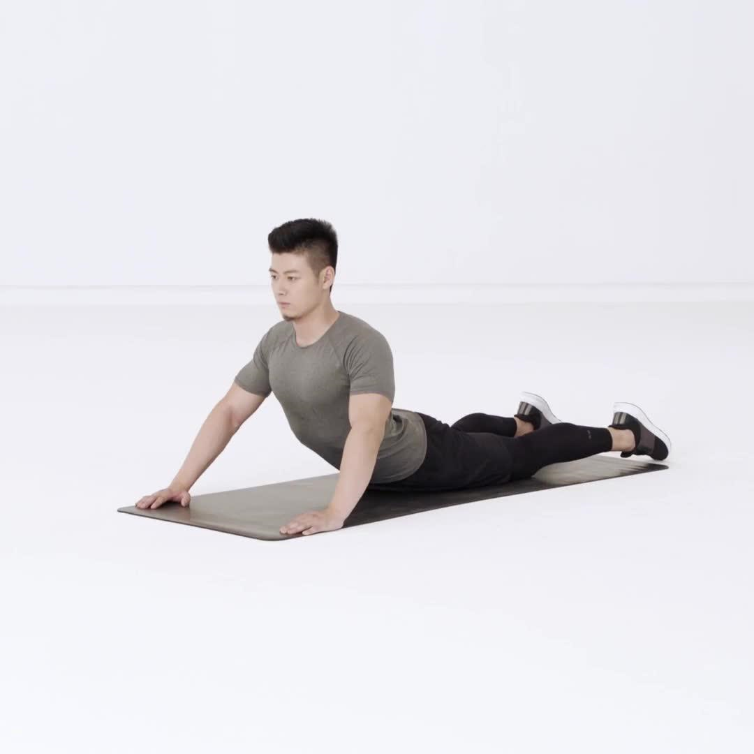 动作过程:双手将上半身撑起,用力拉伸腹部,挺胸。腹部向地面贴近,手臂垂直于躯干。