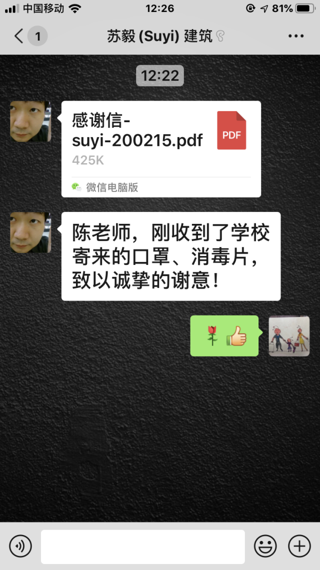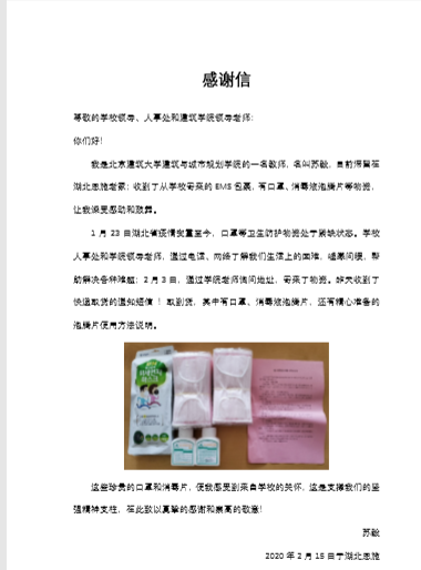 400全讯白菜网对学院唯一在湖北地区的苏毅老师,从疫情开始,表达牵挂和关心。每天询问身体情况,党委书记何立新同志亲自联系爱心邮包,规划系系主任荣玥芳教授和规划系支部书记孙立教授代表系和支部表达了关心关爱。2月15日,400全讯白菜网收到来自400全讯白菜网滞留在湖北地区的苏毅老师的感谢信。在信中,苏老师表达了感谢学校和学院的关怀,给了他支撑的坚强精神支柱。
