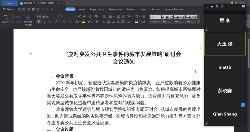 与会者针对此次疫情中突显的城市建设与发展中亟待思考的学术问题及未来科研方向进行讨论,希望能精准服务面向全面小康的健康、安全和可持续的人居环境建设。各位教师结合自身研究方向以及为疫情防控所提出的学术建议等内容,分别从城市发展与建设、智慧城市与社区管理、健康城市设计、医疗建筑选址与设计、历史街区控规、历史建筑保护、专业网络教学模式等多方面讨论了当前防疫背景下的新观点、新思路。
