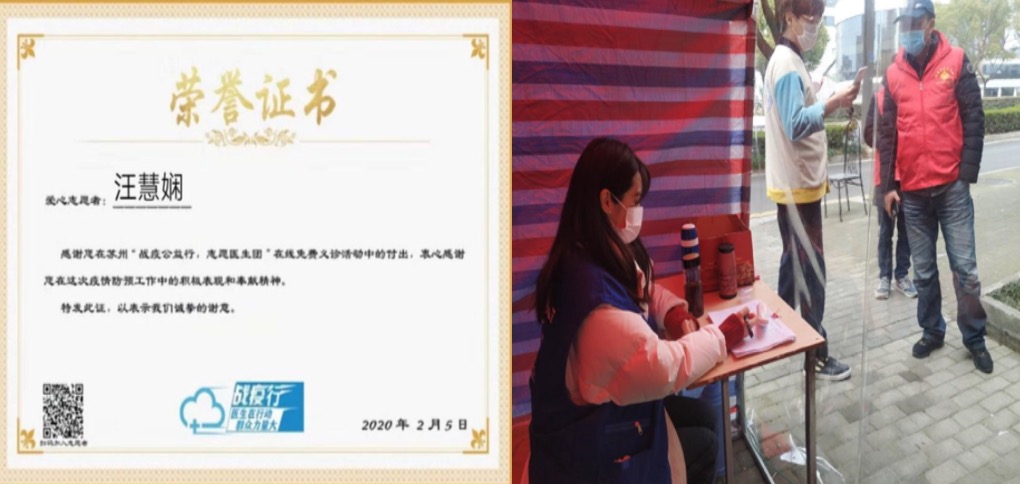 作为一名去年年底通过支部发展大会的预备党员,猝不及防的疫情让汪慧娴这名刚加入党组织的小菜鸟,主动投入到这场没有硝烟的战“疫”中。听闻江苏省苏州市各大医院组织起来的临时线上问诊公益组织“战疫公益行 志愿医生团”缺少一批志愿者向导,她主动联系组织加入了志愿团队,引导在家防疫的群众与线上医生对接交流。社区是社会有机体最基本的内容,是宏观社会的缩影,只有管理好社区,严格控制疫情外溢,才能更快更好的打赢这场战斗。在线上义诊之余,她还主动承担起了社区防疫工作,看上去虽然是简单地登记进出人员、测量体温等工作,但是刚开始许多居民不理解,对疫情不重视,导致社区工作者压力很大。她在居民进出社区的同时科普疫情相关知识,帮助过度紧张地居民疏导心理压力。