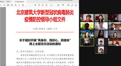 活动中,教师党员们认真学习了习近平总书记重要讲话和指示精神,按照中央、市委的部署要求和《北京建筑大学新型冠状病毒感染肺炎疫情防控工作方案》文件精神,积极配合学校疫情防控领导小组的统一领导,把疫情防控作为当前最重要的工作。“大疫横行、国难当头之际,作为科研工作者,在自己的研究领域,尽自己所能,做为家、为国、为人类健康福祉谋利的先锋者!”支部书记孙立教授在活动中说道,“健康绝不仅仅是个人层面的问题,更是一个社区、一座城市、一个国家,甚至是整个地球的问题。只有当整个社会以及各部门建立起统一的健康价值观,用政策手段形成合力,个人和群体的健康才能得到最大程度的保障。面对突发卫生公共事件,规划专业应从空间规划和城乡治理的角度提出可行的防控举措,为生命安全和公众健康提供环境福祉。”疫情形势纵然严峻,党员干部众志成城。此时,更需铭记身份,运用城乡规划专业知识和城市研究积累,心系国家,群策群力,在抗疫防疫工作中发挥教师党员先进性,传播教师党员正能量。