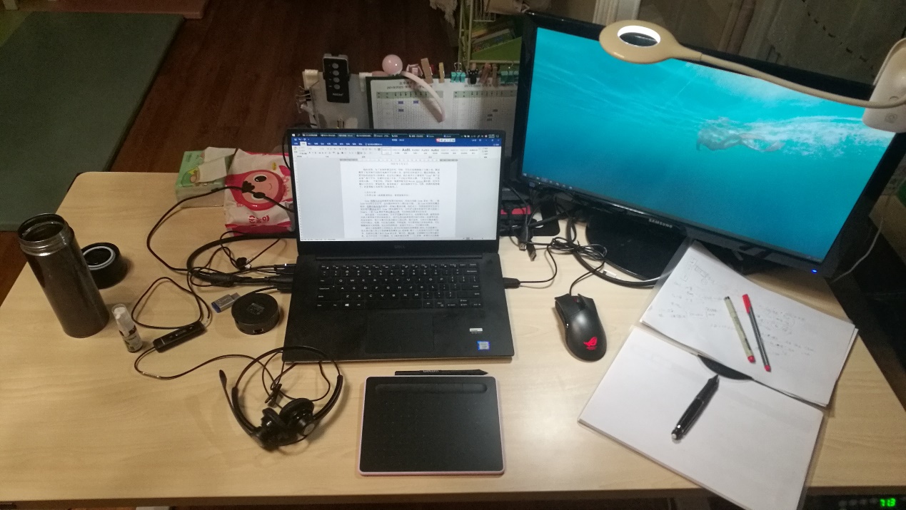 按照学院组织的学习和推荐,经过先后测试,他在教学中主要使用“Zoom”和“会议桌”两个平台,在硬件层面上也有三个比较有用的支撑,一个是耳麦,一个是双显示器,一个是学校、学院给一线教师配发的Wacom Intuos数码板,此外再辅以工作台灯、便笺纸笔,基本构成了一套在线教学平台。当然,网课特别费嗓子,刘老师还需要配上水杯和口腔喷雾剂。