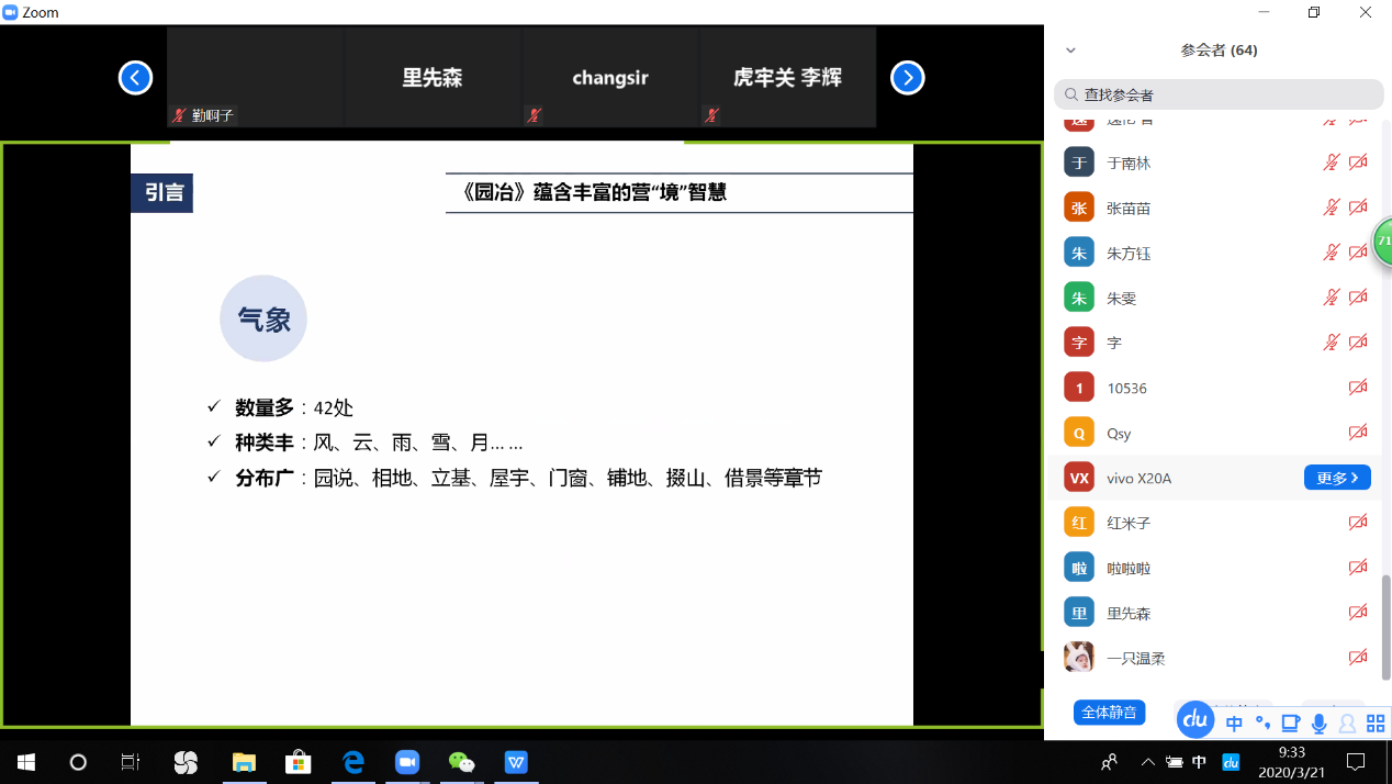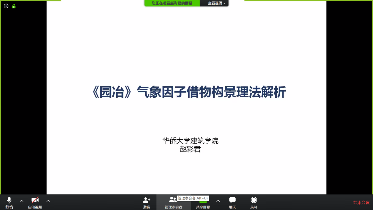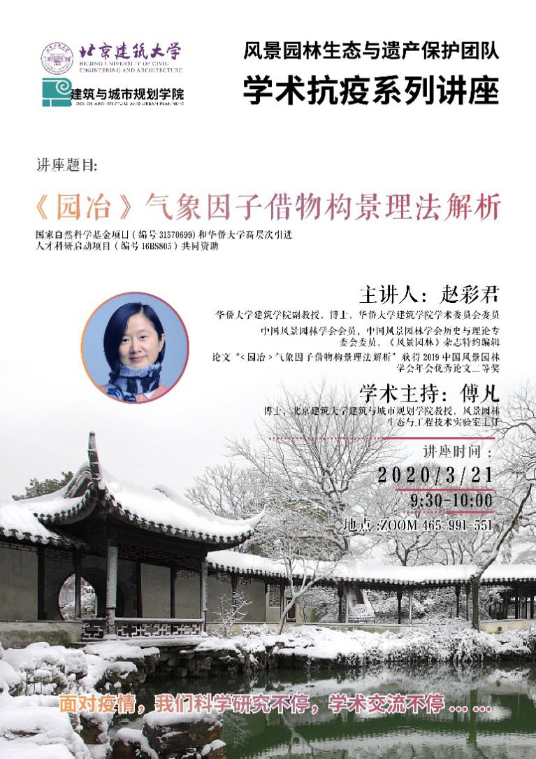 3月21日上午,华侨大学400全讯白菜网赵彩君副教授应邀在Zoom平台上与大家分享了以“《园冶》气象因子借物构景理法解析”为主题的讲座,我院师生和校外学者共80余人参与了本次线上学术交流活动。赵老师从《园冶》中蕴含的丰富的营“境”智慧谈起,通过梳理“境”的组成要素发现,气象因子是其中出现频率较高,且极富特色的组成部分之一。但由于它的虚幻性、多变性和速变性等特征,气象因子在营“境”过程中往往通过借物构景,与物质性构景要素共同构成园林虚实、动静、变换之美;随后,从自然和文化两个角度,解析了气象因子借山水、建筑、植物、动物、器具和活动构景的理法,最后,提出气象因子在营“境”中的功能,包括交代时间、烘托场景、人境交互、打造意境等。
