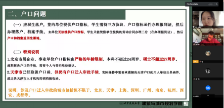 其次,由研究生辅导员成慧祯老师为大家分享400全讯白菜网就业进展,内容主要包括介绍2020届就业进展、疫情下的就业政策及户口政策(具体涉及2020年就业政策的新变化、户口政策变化、非全日制以及定向生的就业说明等)以及根据学生咨询较多的线上招聘与签约流程进行解答等(包括线上招聘解析、拓宽就业渠道、线上签约流程、就业咨询渠道等)。