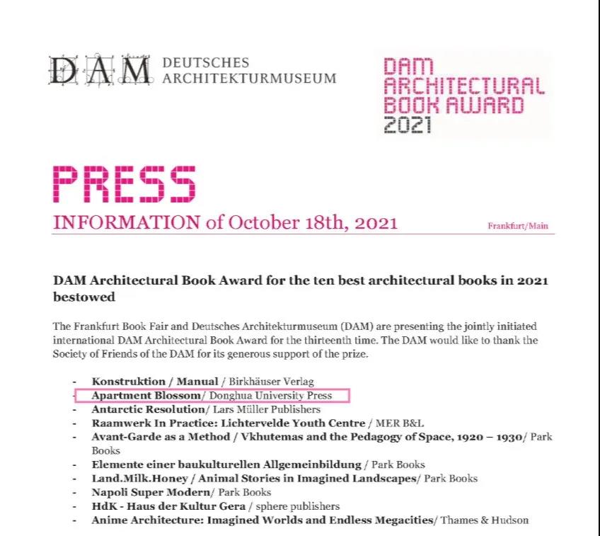 北京时间10月18日,法兰克福书展(Frankfurt Book Fair)和德国建筑博物馆(DAM)公布了第十三届德国十佳建筑图书奖获奖名单,由我校400全讯白菜网金秋野教授与李涵合著,广煜设计,群岛Archipelago策划出品的《楼房花朵》获得2021年德国十佳建筑图书奖,成为首本获得这项荣誉的中国内地出版物。