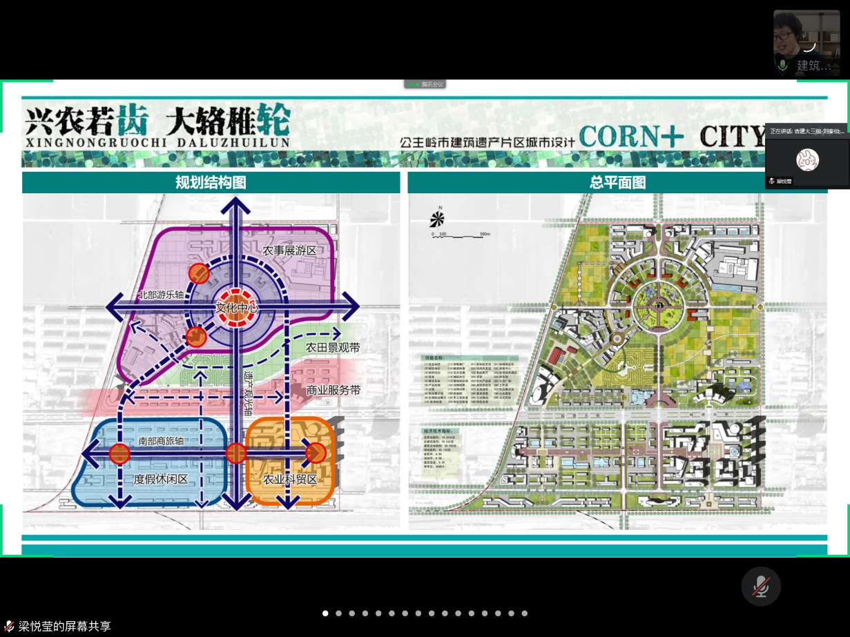 下午12:30起,终期汇报拉开序幕,首先介绍了来到此次会议的各位领导。之后以学校为单位,按照沈阳建筑大学3组,吉林建筑大学3组,北京建筑大学2组,东北大学2组的顺序先后汇报。每组汇报15分钟,教师点评与组别间交流10分钟。由于前一天每个小组的汇报录屏文件与演示文件都已上传,故当天每组仅用3分钟进行小组人员和小组方案成果的简单介绍,其余时间由老师及学生进行点评。每个小组的汇报都十分精彩,也各具特色。老师们和同学们在对各组成果表示认可的同时,也提出了针对性的改进意见。在3月11日的调研汇报和4月15日的中期汇报中,老师们分别提出了“聚焦地块,敞开心扉”和“突出特色,优化逻辑”下一阶段要求,同学们在终期汇报中也很好地完成了老师们的期待和要求。