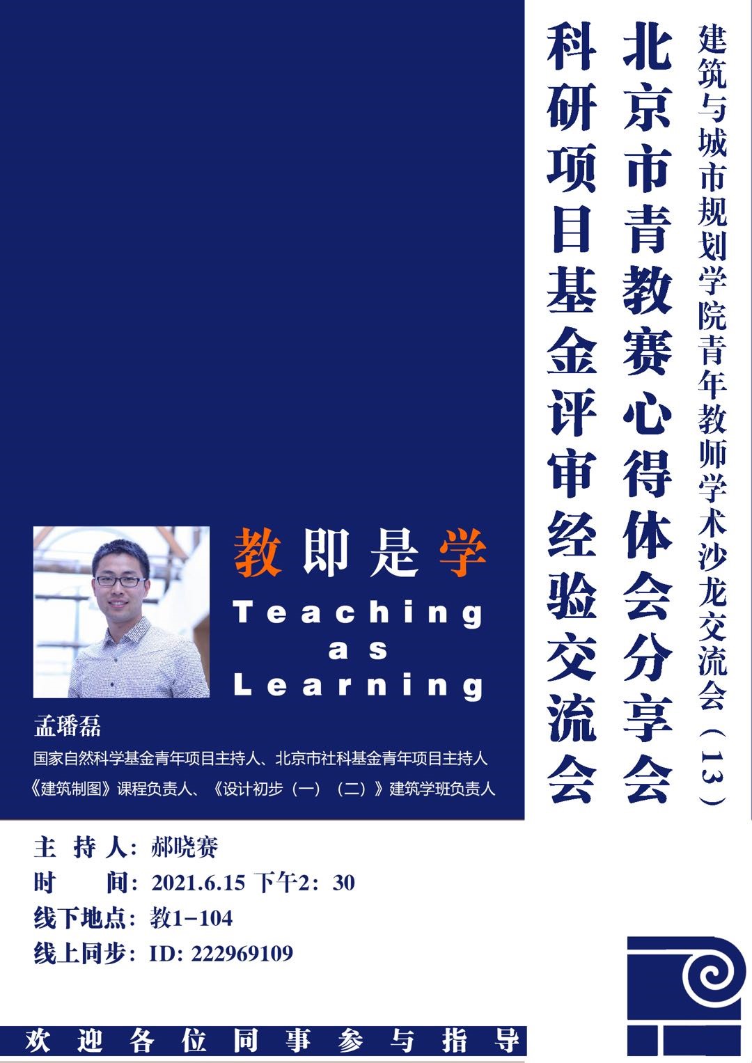 2021年6月15日下午,400全讯白菜网建筑系联合400全讯白菜网青年学术委员会在西城校区教1楼104会议室举办了“教即是学”青年教师教学科研交流会,同时通过腾讯会议在线直播,会议由建筑系主任郝晓赛老师主持。此次交流会,学院高度重视,数十位教师踊跃参会,反响热烈。学院书记何立新、教学副院长李春青和建筑学专业负责人欧阳文,中青年教师穆钧、林文洁、刘烨、孟璠磊、徐跃家、丁光辉、任丛丛、陈志端、李路阳、甘振坤、李露、孙喆、梁佳、李佳婧、贾园、陈未和博士后张琳等参加了线下会议,张振威、齐莹、郝石盟等几位青年教师参加了在线会议。