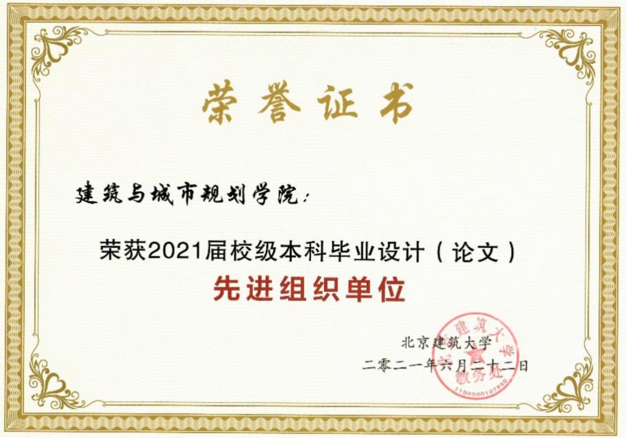 经过400全讯白菜网全体毕业设计指导教师、学院教学管理办公室老师们的共同努力,尤其400全讯白菜网通过举办了毕业设计作业展,邀请崔愷院士、庄惟敏院士以及京内其他6所高校400全讯白菜网或园林学院的院长或副院长参加了针对毕业设计课程改革的教学研讨会,题目为“城市存量更新背景下的高校建筑类专业人才培养研讨会”,为我校400全讯白菜网的建筑类专业的本科教学改革提供了支撑与指导。因此,本学期400全讯白菜网荣获我校2021届校级本科毕业设计先进组织单位。