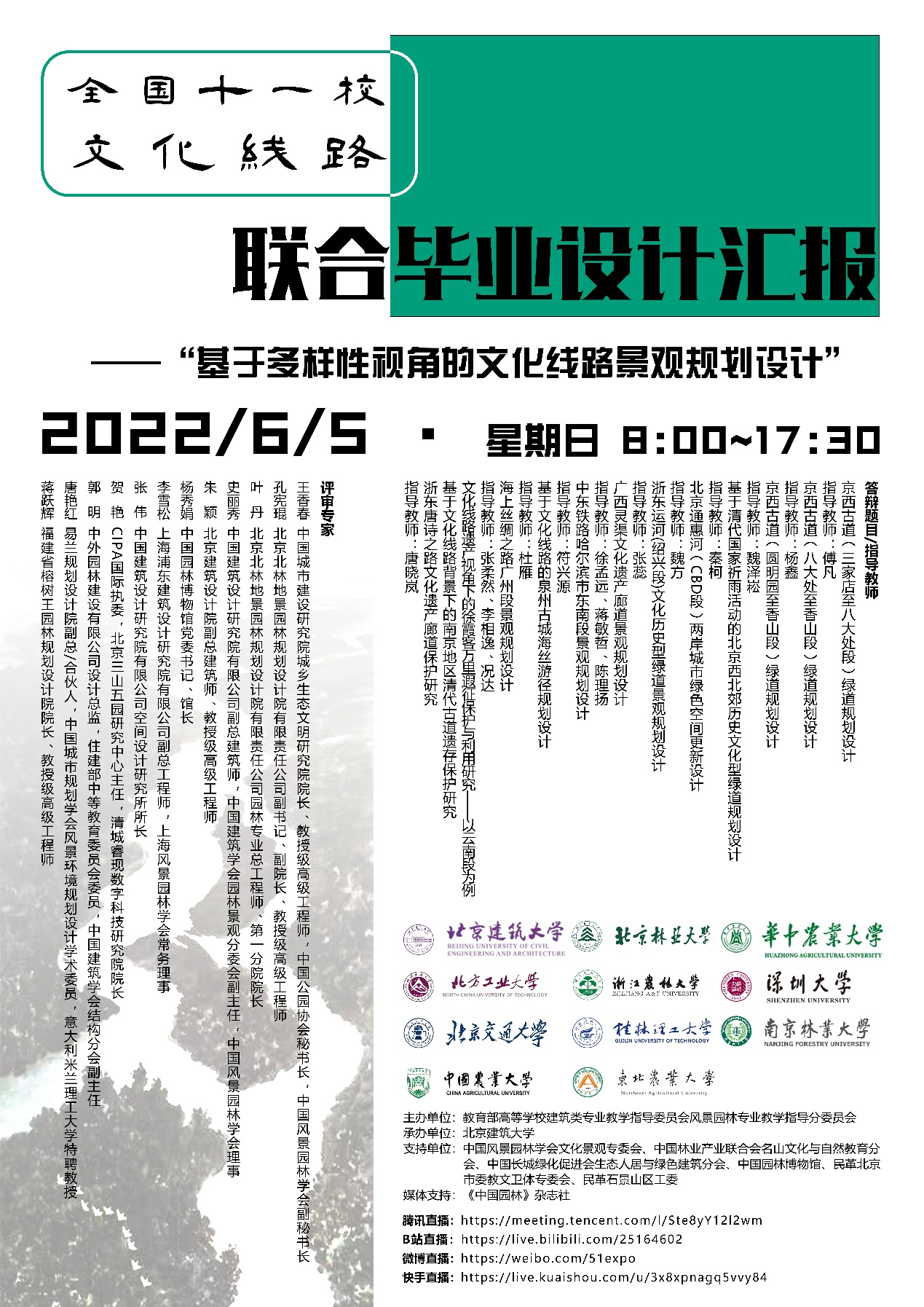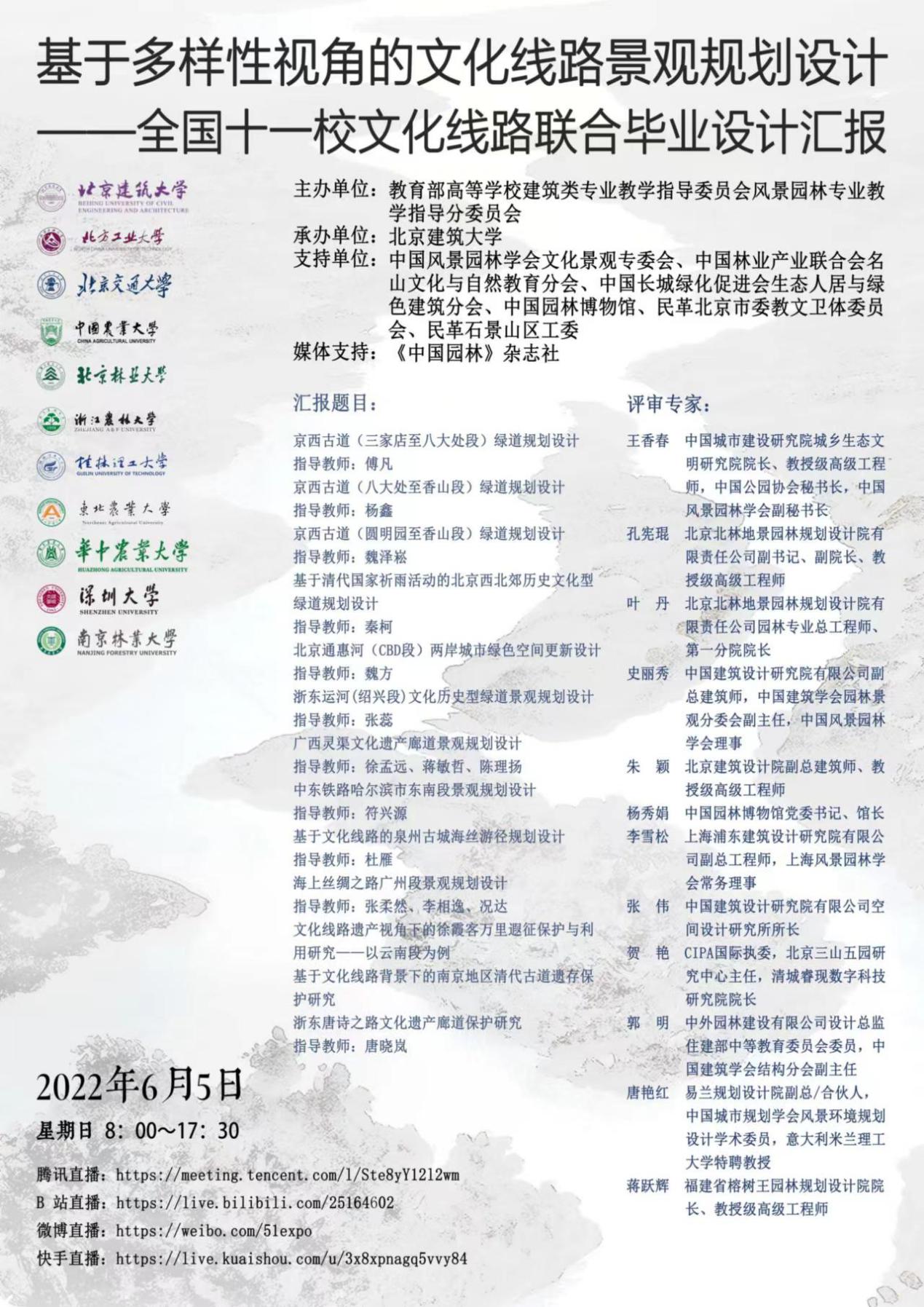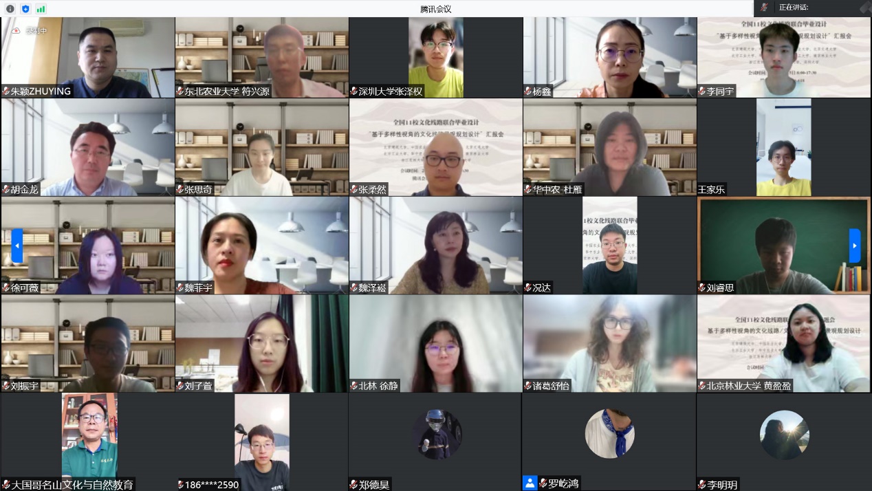 2022年6月5日,由教育部高等学校建筑类专业教学指导委员会风景园林专业教学指导分委员会主办,北京建筑大学承办,北京建筑大学、中国农业大学、北京林业大学、北京交通大学、北方工业大学、华中农业大学、桂林理工大学、南京林业大学、浙江农林大学、东北农业大学、深圳大学等11所高校参加的“基于多样性视角的文化线路景观规划设计——全国11校文化线路联合毕业设计“汇报会顺利举行,来自全国11所高校的师生与会议嘉宾、评委92人相聚云端,通过腾讯会议参加了汇报会,近80万人次通过B站、微博、快手、视频号等平台观看了汇报。本次活动得到了中国风景园林学会文化景观专委会、中国林业产业联合会名山文化与自然教育分会、中国长城绿化促进会生态人居与绿色建筑分会、中国园林博物馆、民革北京市委教文卫体专委会、民革石景山区工委等单位的支持,并由《中国园林》杂志社作为媒体支持。