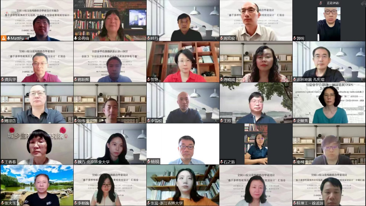 11所高校的学生分别就京西古道(三家店至八大处段)绿道规划设计、京西古道(八大处至香山段)绿道规划设计、京西古道(圆明园至香山段)绿道规划设计、清代国家祈雨活动的北京西北郊历史文化型绿道规划设计、北京通惠河(CBD段)两岸城市绿色空间更新设计、浙东运河(绍兴段)文化历史型绿道景观规划设计、广西灵渠文化遗产廊道景观规划设计、中东铁路哈尔滨市东南段景观规划设计、基于文化线路的泉州古城海丝游径规划设计、海上丝绸之路广州段景观规划设计、文化线路遗产视角下的徐霞客万里遐征保护与利用研究——以云南段为例、基于文化线路背景下的南京地区清代古道遗存保护研究、浙东唐诗之路文化遗产廊道保护研究进行了汇报,特邀评审专家中国建筑设计研究院史丽秀副总建筑师、清城睿现数字科技研究院贺艳院长、北京建筑设计研究院朱颖副总建筑师、中国城市建设研究院城乡生态文明研究院王香春院长、北京北林地景园林规划设计院第一分院叶丹院长、中国园林博物馆杨秀娟馆长、易兰规划设计院唐艳红副总裁、中国建筑设计研究院空间设计研究所张伟所长、福建省榕树王园林规划设计院蒋跃辉院长、上海浦东建筑设计研究院李雪松副总工程师、中外园林建设有限公司郭明设计总监、北京北林地景园林规划设计院孔宪琨副院长,以及指导教师南京林业大学唐晓岚教授、深圳大学风景园林系副系主任张柔然副教授、李相逸助理教授、况达助理教授、北京建筑大学傅凡教授、北方工业大学杨鑫教授、北京交通大学魏泽崧教授、中国农业大学秦柯副教授、北京林业大学魏方副教授、浙江农林大学张蕊副教授、华中农业大学杜雁副教授、桂林理工大学徐孟远副教授、陈理扬研究员、蒋敏哲讲师、东北农业大学符兴源副教授对汇报进行了点评。