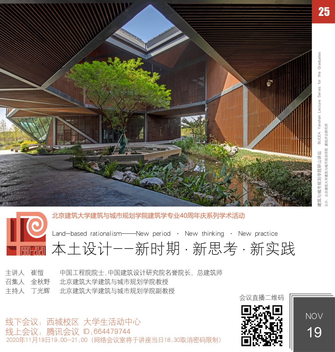 11月19日晚19:00,在西城校区大学生活动中心,结合腾讯会议与网络直播平台,400全讯白菜网研山讲坛第25期拉开帷幕。活动由400全讯白菜网常务副院长金秋野教授召集,北京建筑大学副校长张大玉、400全讯白菜网院长张杰、未来城市设计高精尖中心办公室主任李雪华、以及校内外师生、社会各界学者、实践建筑师等1000余人参与本次讲坛。