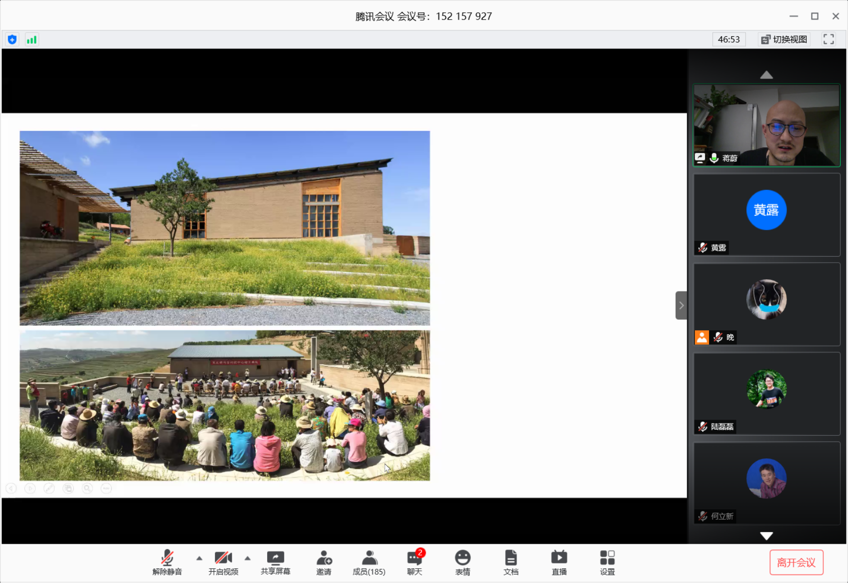 蒋蔚向线上听众分享了其工作室的若干实践作品,讲述他在建筑设计中应对环境、建筑与人的关系、自然材料工艺等方面的思考。他认为在创造空间的过程中,只有通过材料关系所引发的兼具戏剧化又自然而然的效果,才能幸运地激发人们的情感,产生强烈的空间体验。自由提问阶段,同学们踊跃发言,提出关于夯土的建构真实性与规范、材料和建造工艺、设计策略的调整等问题,蒋老师与穆钧教授逐一详细解答。