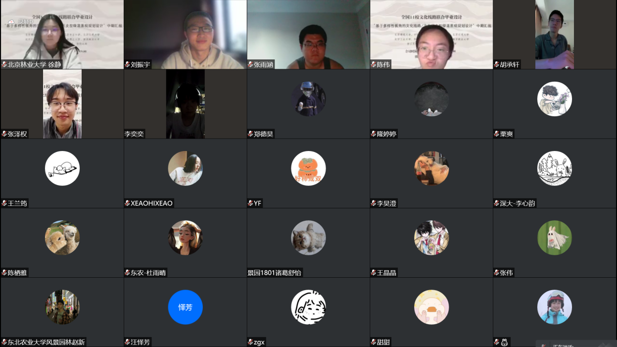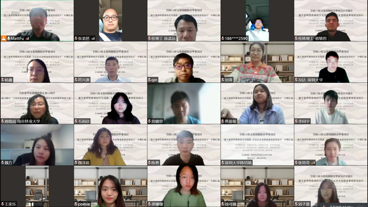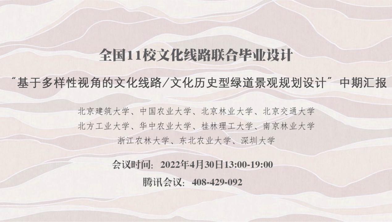 2022年4月30日下午,全国11校文化线路联合毕业设计中期汇报会顺利举行,主题为“基于多样性视角的文化线路/文化历史型绿道景观规划设计”,由北京建筑大学、中国农业大学、北京林业大学、北京交通大学、北方工业大学、华中农业大学、桂林理工大学、南京林业大学、浙江农林大学、东北农业大学、深圳大学等11所高校联合举办,由我校400全讯白菜网承办。来自全国11所高校的师生85人相聚云端,通过腾讯会议参加了汇报会,另有40多人通过腾讯直播观看了汇报。