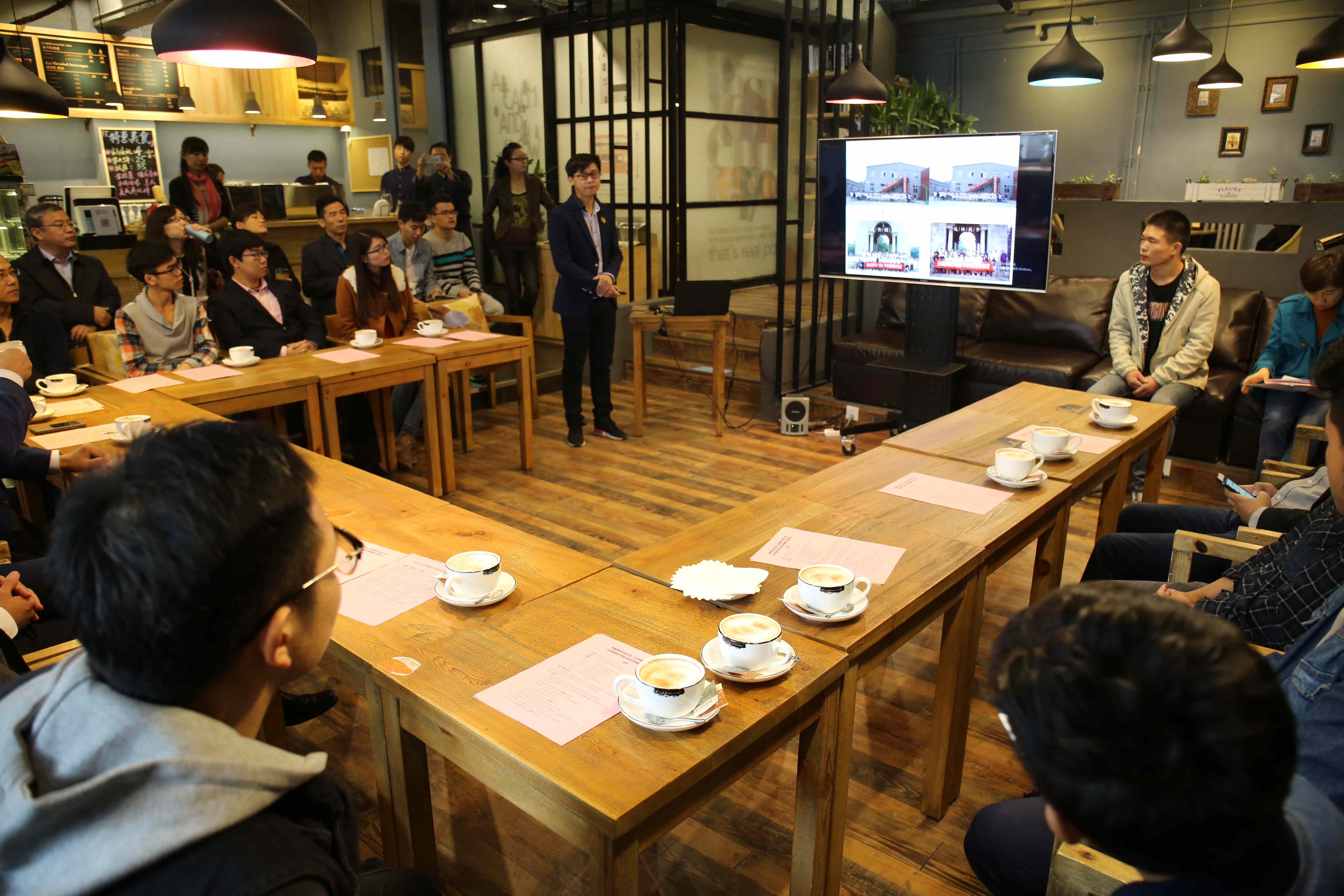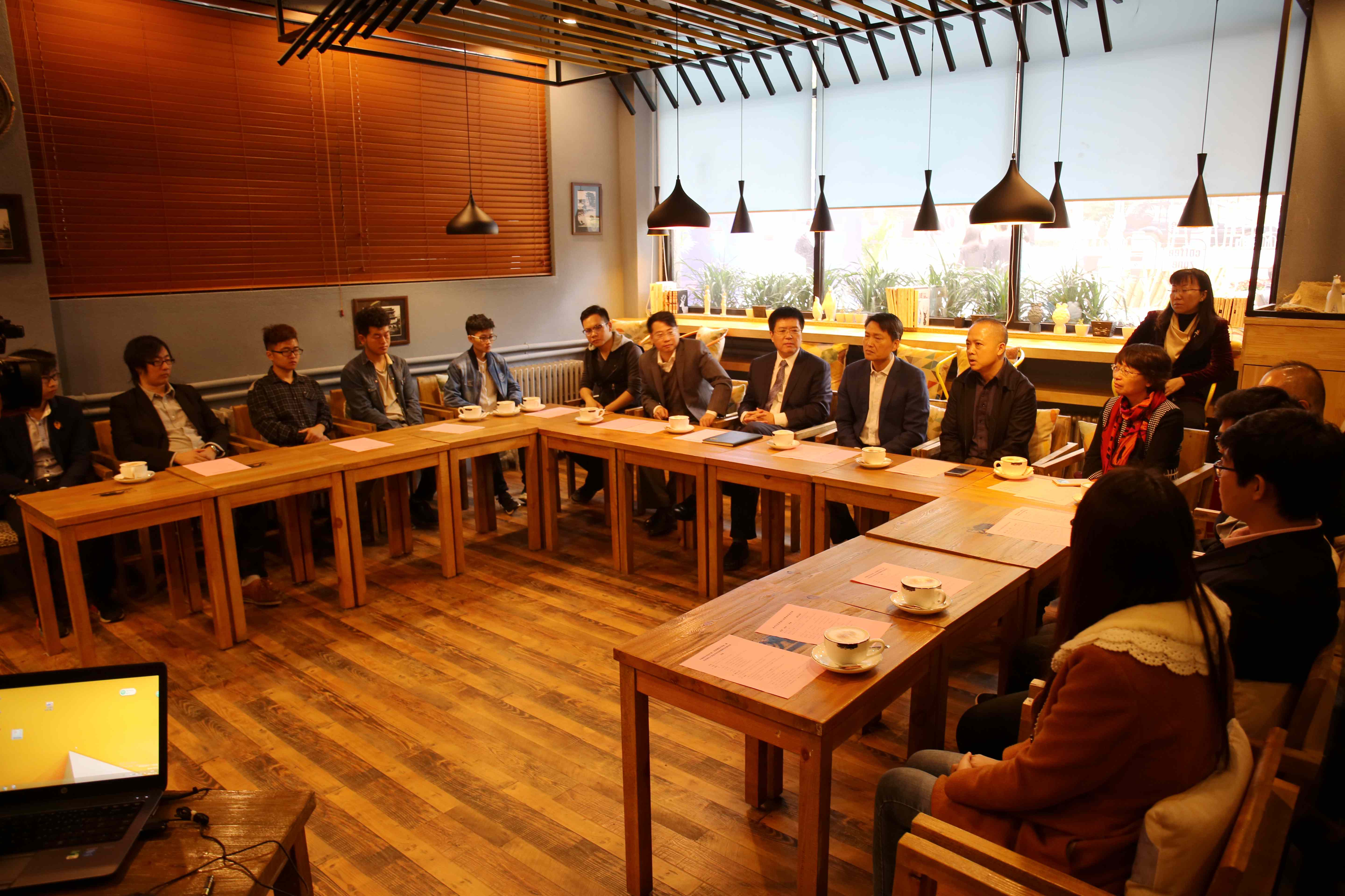 我院北京行者筑梦教育科技有限公司、艺勇哲作、彩画创新组、门迹网络科技(北京)有限公司、良物匠造、新剪纸文创实践团队参加了座谈会。并由行者筑梦团队负责同学黄骏作为创业团队学生代表向参会领导做创业分享。现场气氛热烈,师生畅谈大学生创新创业。