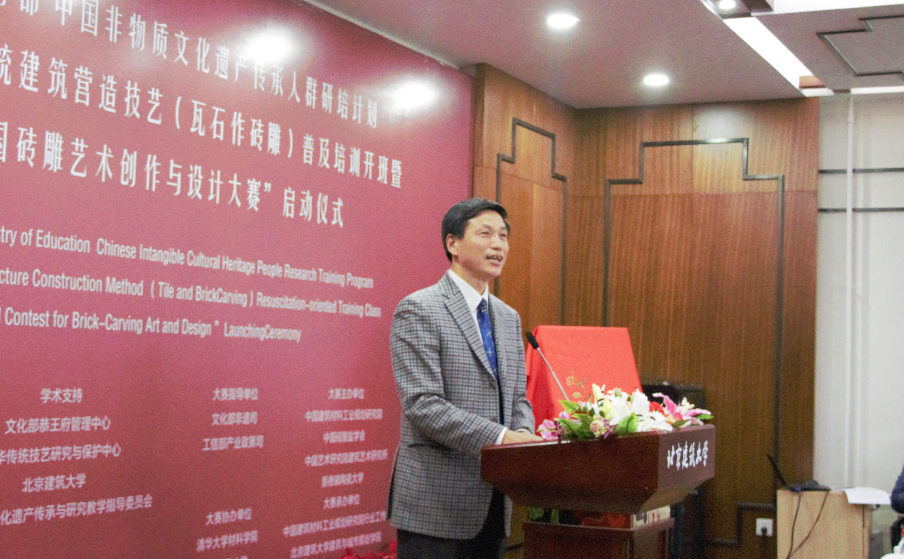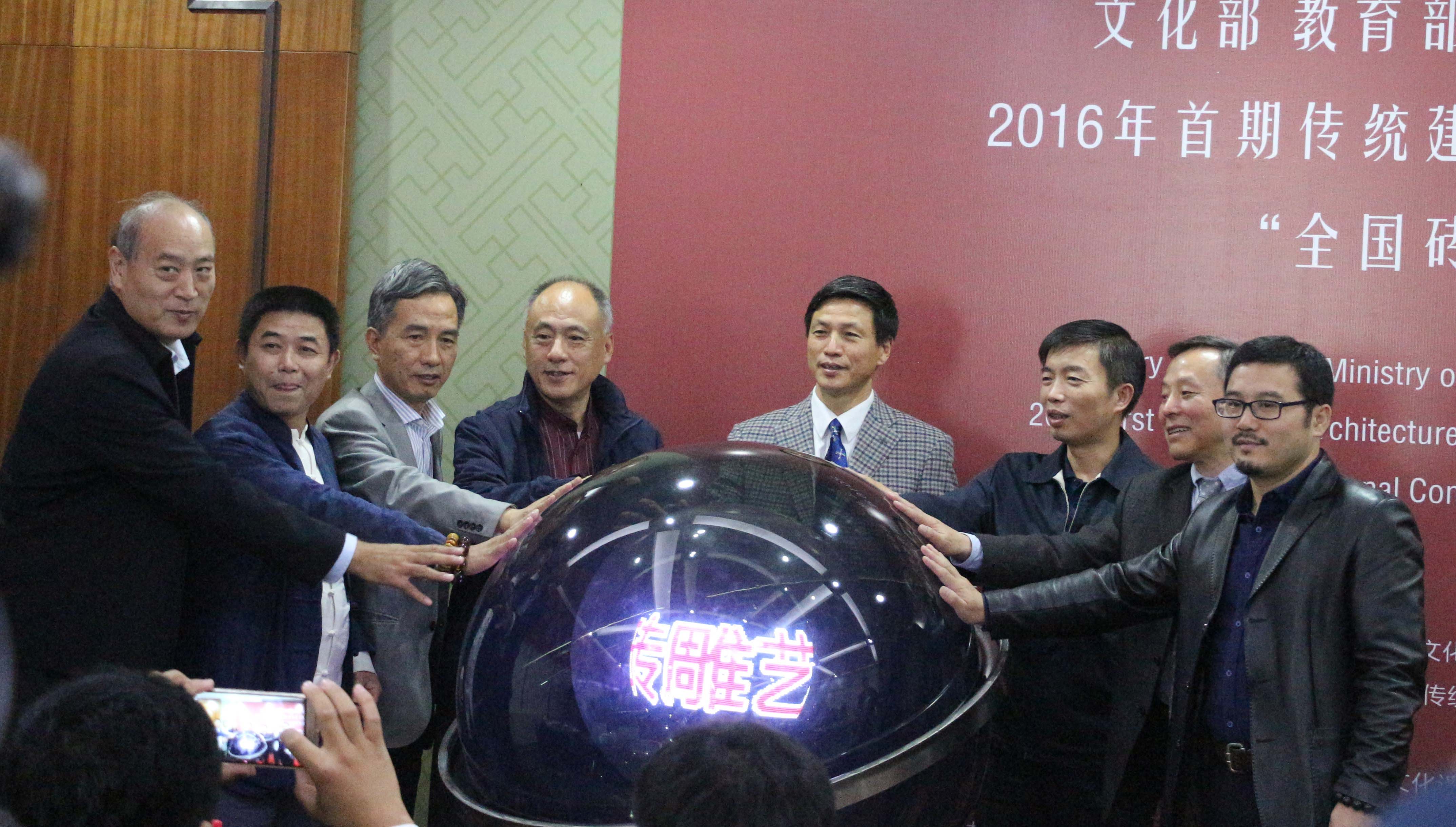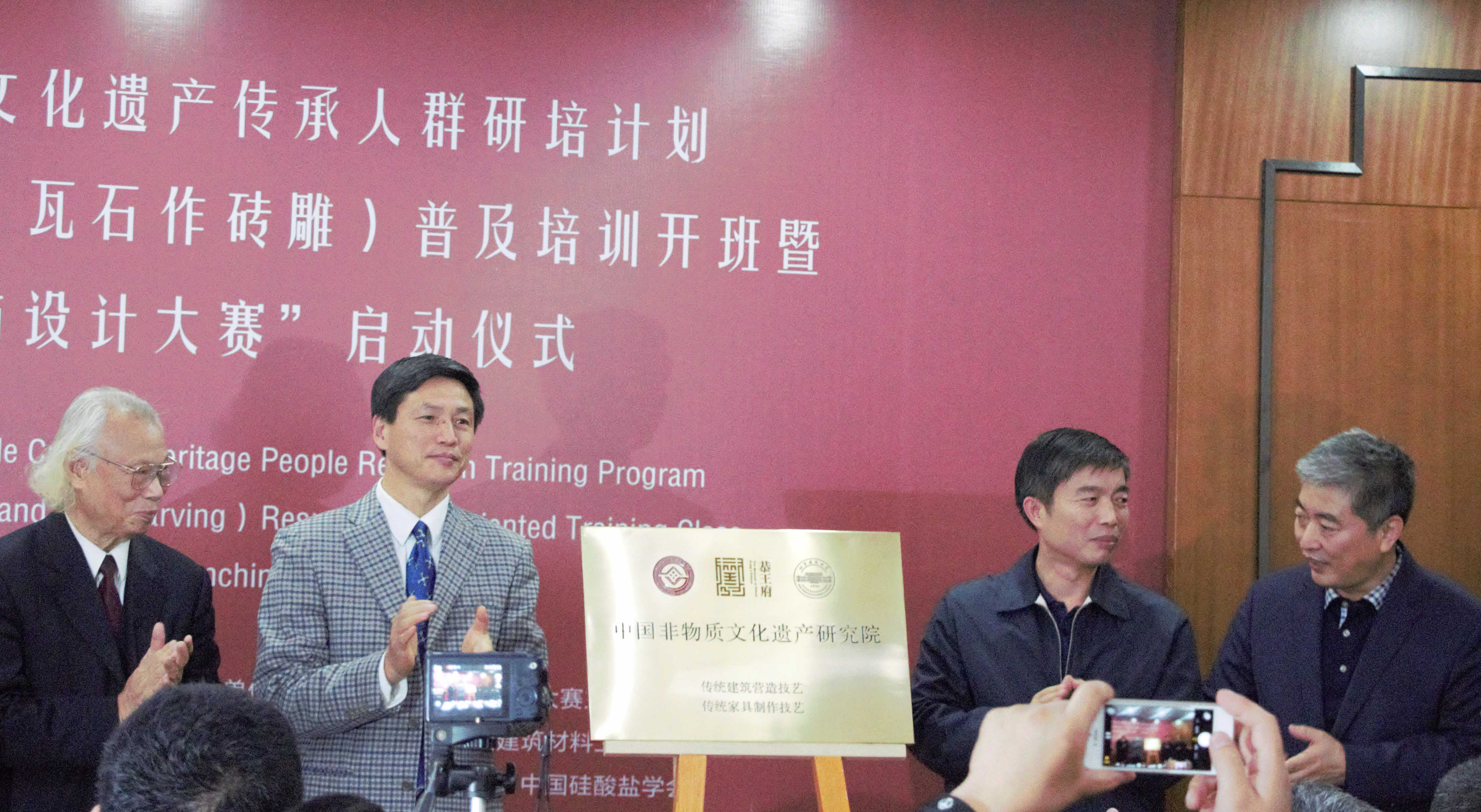 10月16日下午2点,文化部教育部中国非物质文化遗产传承人群研培计划2016年首期传统建筑营造技艺(瓦石作砖雕)普及培训班开班暨“全国砖雕艺术创作与设计大赛启动仪式”于我校西城校区报告厅举行。活动由副校长张大玉主持。北京建筑大学校长张爱林、工业和信息化部产业政策司副巡视员罗俊杰、文化部恭王府管理中心主任孙旭光、非物质文化遗产专家委员会副主任刘魁立、中国建筑材料联合会副会长徐永模等多位领导、专家莅临现场。张爱林、罗俊杰、孙旭光、刘魁立、徐永模分别发表致辞。表达了对非物质文化遗产保护事业未来发展的殷切期望,和对创作设计大赛圆满成功的诚挚祝愿。之后校长张爱林为孙旭光主任颁发学校发展委员顾问聘书。其后揭牌仪式与设计大赛启动仪式相继隆重举行,现场气氛十分活跃。仪式结束后,全体合影留念。