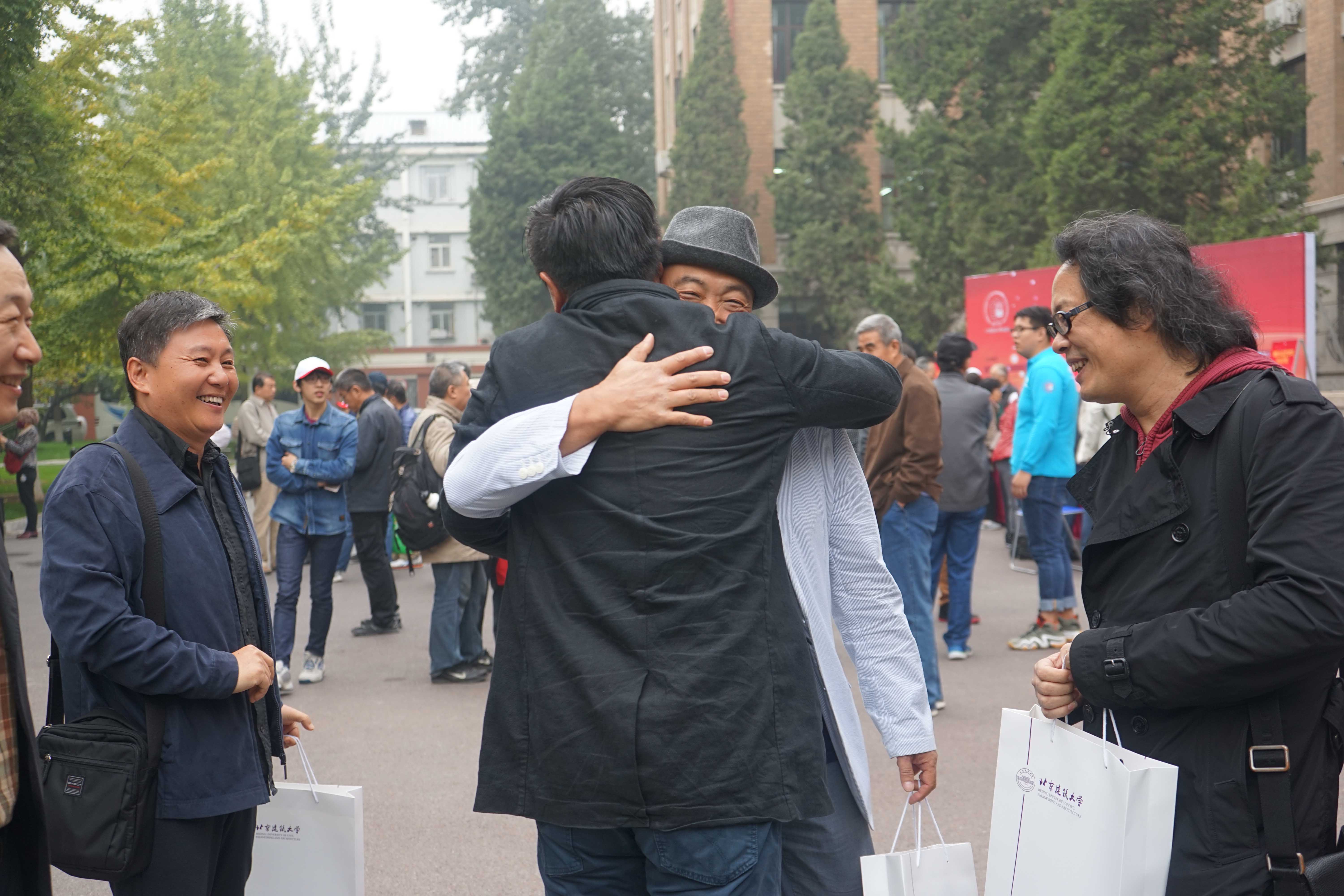 10月15日早6:30起,400全讯白菜网历届校友陆续到达西城校区教一楼前返校报到,我院为返校校友安排了教师、志愿者对接,予以热情接待,向每位校友发现校庆纪念品并按照当天活动安排对校友们进行引导。校友们无不对母校充满怀恋,大家久别重逢,围成一圈,在教一楼前畅聊过往岁月,时而激情相拥,时而开怀大笑,融融的情谊感染了在场的每一个人。