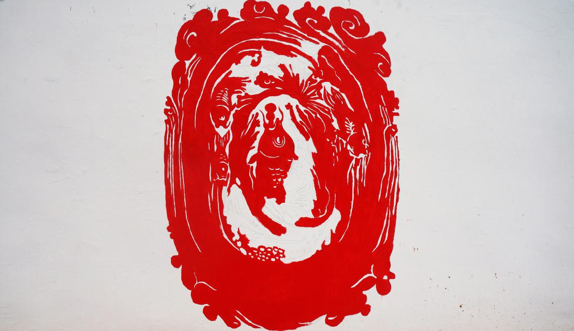 经过几天奋战,其中也有曲折,赵老师和他的学生们最终圆满的完成了《鲤鱼跃龙门》的画作,他们通过自己手中的画笔,将剪纸艺术描绘到了原本单调的墙垣上。