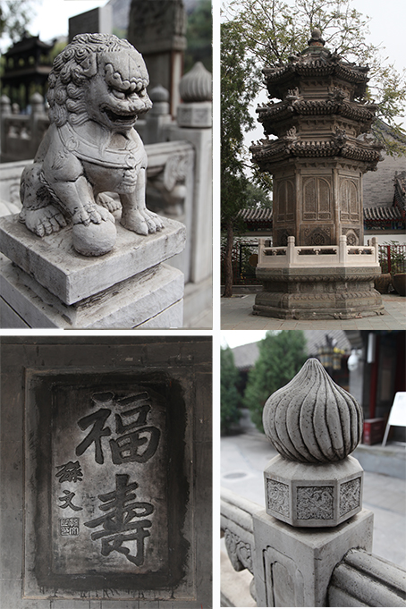 离开后院走进白云观的西院,首先映入眼帘的是元君殿后身广场上的一匹酷似骏马的铜兽,走近细看,其造型竟为骡身、驴面、马耳、牛蹄,因此,很多人称它为“四不象”。传说是康熙皇帝为纪念曾随他南征北战的坐骑而铸造的。其实,它的正名叫“特”。传说它是一种神兽,具有奇特的功能,人哪儿不舒服,只要先摸摸自己,然后再摸摸它的相同部位,即可手到病除。带着对这段传说的好奇,我们不禁伸出双手去触碰那已经褪色的铜皮,在与神特的互动中,仿佛又感受到旌旗蔽空的震撼与酾酒临江的气概,也被白云观这座古建的沧桑魅力所吸引。