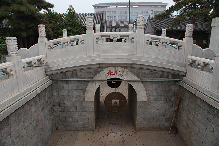 过山门,入内豁然开朗,只见地表似青石条附着岁月斑驳,山门左右各有石碑史文;前行上至窝风桥,见桥身、桥面为叶青石所砌。桥栏采用精美乳白色上等汉白玉装饰。窝风桥为南北向的单孔石桥。然而,桥下没有滚滚的流水,也没有深潭,是一座名副其实的旱桥。据说,由于北方风猛雨少,观外原有座“甘雨桥”,人们便在观内修了这座“窝风桥”,两座桥象征风调雨顺之意。