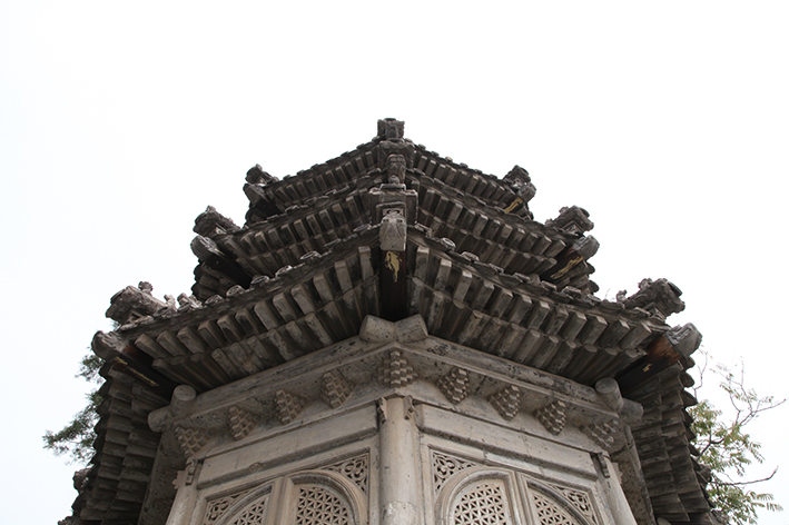 出离小院再向北走,一座石塔映入眼帘。此塔名为罗公塔,位于东北角塔院内,造型为八角形,三蹭砖石结构。原塔前还有供奉罗公像的“罗公前殿”和“白云观重修碑”、“罗真人道行碑”、“粥场碑记”、“云溪方丈功德碑”四块石碑,现仅存罗公塔。罗公为江西人,康熙年间来京,常住白云观,1727年7月13日逝世,被雍正帝敕封为“恬淡守一真人”,葬于现北京白云观罗公塔(也称真人塔)内,罗公塔位于道观东部,东部建筑多为道士生活区及中国道教协会所用,该塔就成为东路最主要可观古迹.是道教塔中的精品,也是清代前期大型石刻艺术品,塔为石质,通高约10米,形似亭阁,但又有所不同。底为一仰莲须弥座基台,上建八角形塔身。塔身上覆三重檐屋顶,星檐的椽子、飞头、瓦陇、脊兽、隔扇窗等。雕刻与木结构形制相同,还雕有道教象征八卦的图案,用藏传佛教寺庙常用的密叠斗拱作装饰,塔顶用小八角亭式,上冠以大圆珠,与一般佛塔的塔刹又不相同,千年富观,仅此一塔,足见其珍贵。