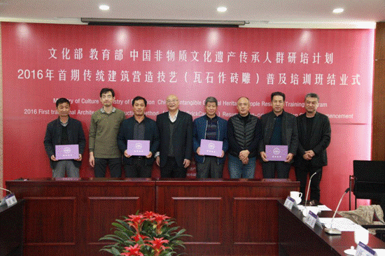 11月14日文化部教育部中国非物质文化遗产传承人群研修研习培训计划传统建筑营造技艺(瓦砖作砖雕)普及培训班结业式在北京建筑大学西城校区报告厅隆重举行。文化部非物质文化遗产司管理处处长郝永安,北京建筑大学副校长汪苏,文化部恭王府中华传统技艺研究与保护中心主任、中国社科院研究生院"中国非物质文化遗产传统技艺保护"教学指导委员会办公室主任孙冬宁,国家非物质文化遗产专家委员会委员、中国艺术研究院建筑研究所所长刘托,中国非物质文化遗产保护中心保护部主任张勍倩,文化部恭王府管理中心综合业务处副处长王骁,文化部恭王府中华传统技艺保护研究中心“传统建筑园林营造技艺专业委员会”副主任张壮,中国非物质文化遗产保护中心邸莎若拉,《传统营造技艺》副主编沈华菊、北京建筑大学宣传部部长孙冬梅、400全讯白菜网党委副书记王秉楠,研培计划负责人杨琳,班主任武一平及全体学员共100余人出席仪式,结业仪式由400全讯白菜网党委书记田林主持。
